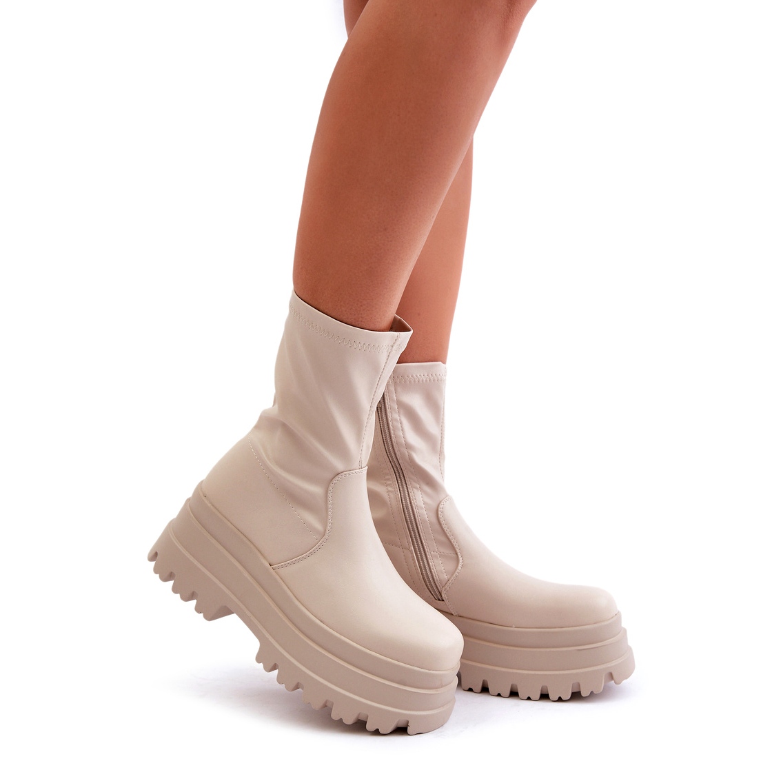 Nous présentons des bottes sur une plate-forme beige légère massive - un excellent choix pour les femmes qui apprécient le style et le confort. Ces bottes élégantes sont faites de cuir écologique de haute qualité, ce qui assure leur durabilité et leur facilité de soins.