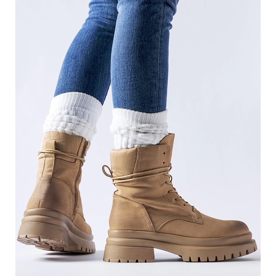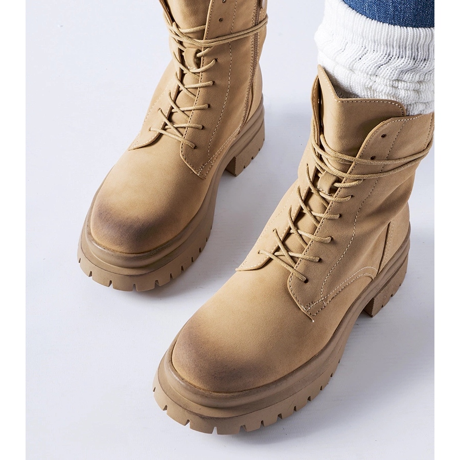 Les pièges modernes dans une couleur universelle et beige qui combinent un style libre avec des solutions pratiques pour la saison d'automne. Le nez usé leur donne le caractère et un accent légèrement "brut", et la forme ronde des doigts assure le confort et plus d'espace pour le pied.