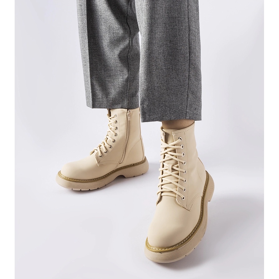 Les bottes sont fabriquées en cuir écologique, visible à la fois dans le matériau extérieur et dans le matériau de la semelle intérieure. La semelle est en plastique. Les deux parties de la chaussure sont beiges, tout comme la semelle – le fabricant décrit la couleur comme « Beige ».