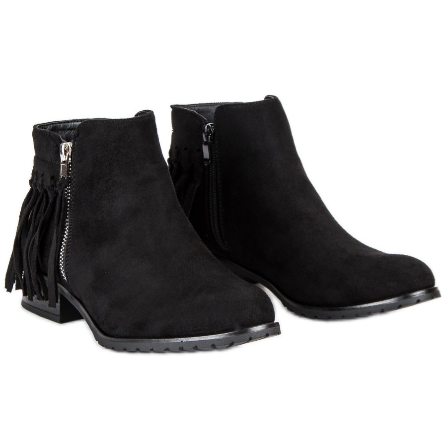 Les bottines Kayla au style bohème sont un choix parfait pour les femmes qui souhaitent allier mode et confort. Ces bottes en daim noir se distinguent non seulement par leur aspect élégant, mais aussi par leur finition soignée en daim écologique de haute qualité. Le devant classique avec un bout rond et des détails décoratifs, comme une fermeture éclair argentée et de longues franges à l'arrière, leur confèrent un caractère unique.