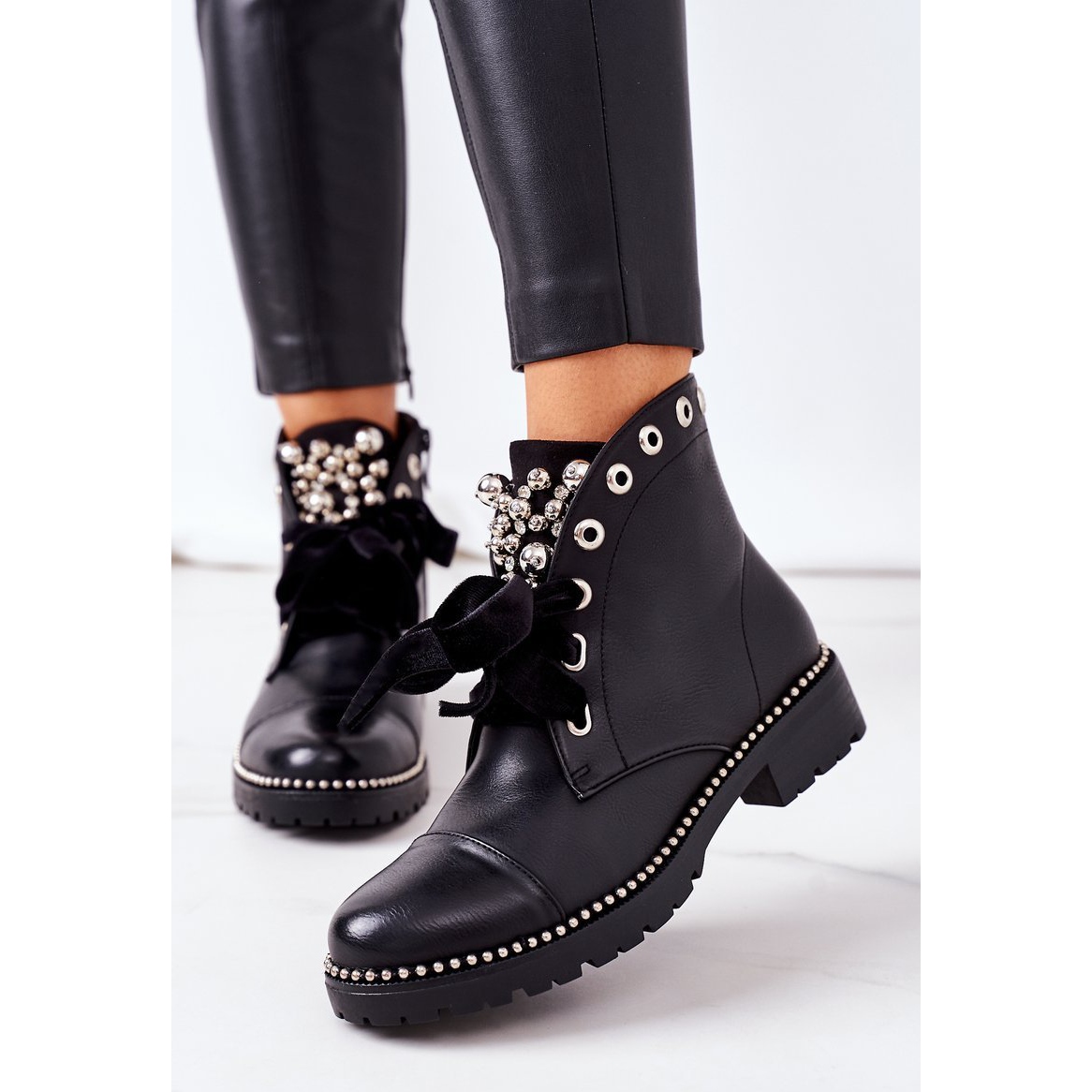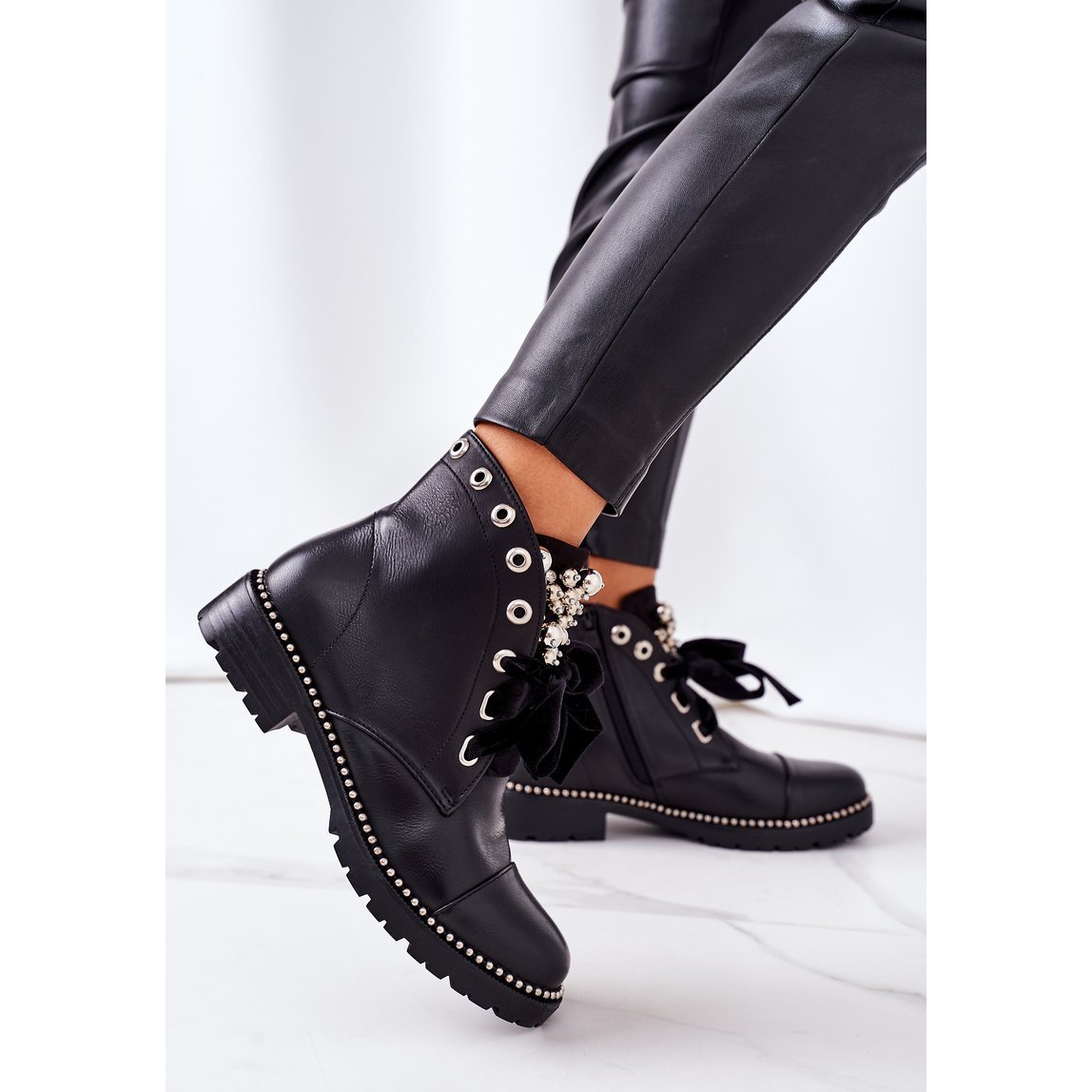 Le modèle se caractérise par une coupe originale du dessus et des décorations uniques. Les perles métalliques, les strass et le ruban confèrent aux chaussures un charme unique et attireront donc certainement l'attention des autres. Les bottes sont disponibles dans une couleur noire classique, ce qui en fait un ajout universel à de nombreux styles.