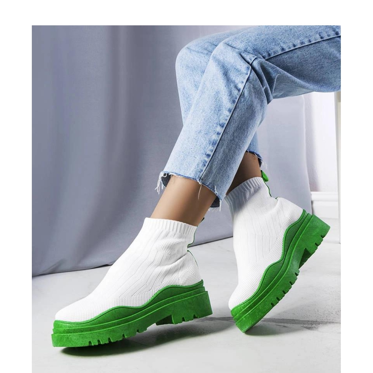 Les bottes chaussettes blanches avec une semelle verte sont une proposition pour les personnes qui apprécient le confort et le style. Les bottes sont à enfiler, en tissu élastique qui s'adapte à la forme du pied. La tige arrive jusqu'à mi-mollet et est ornée d'une rayure de la couleur de la semelle, qui ajoute de l'originalité aux chaussures. Une semelle épaisse et colorée avec un protecteur assure la confiance dans votre démarche et le confort de port. Les chaussures ont un bout rond et la numérotation est standard, cela vaut donc la peine de choisir votre taille. Parfaits pour les journées froides car ils sont isolés. Les bottes à semelle massive sont un succès des dernières saisons et ajouteront certainement du caractère à n'importe quel style.