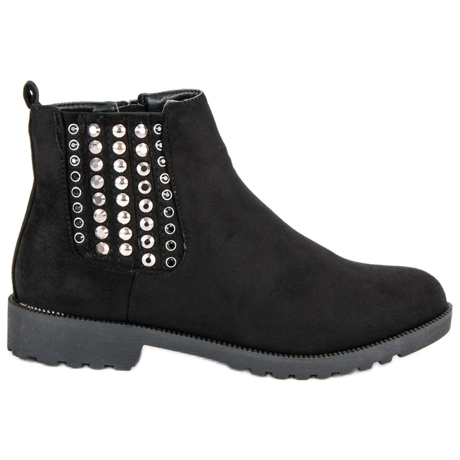 La couleur noire et la forme subtile et ronde du bout les rendent chic, et le talon délicat et plat de 3,0 cm souligne la forme féminine des chaussures, tout en assurant un confort au quotidien. Des rangées de strass brillants se trouvent sur le côté des bottines Chelsea, qui leur donnent du caractère et attirent l'attention.