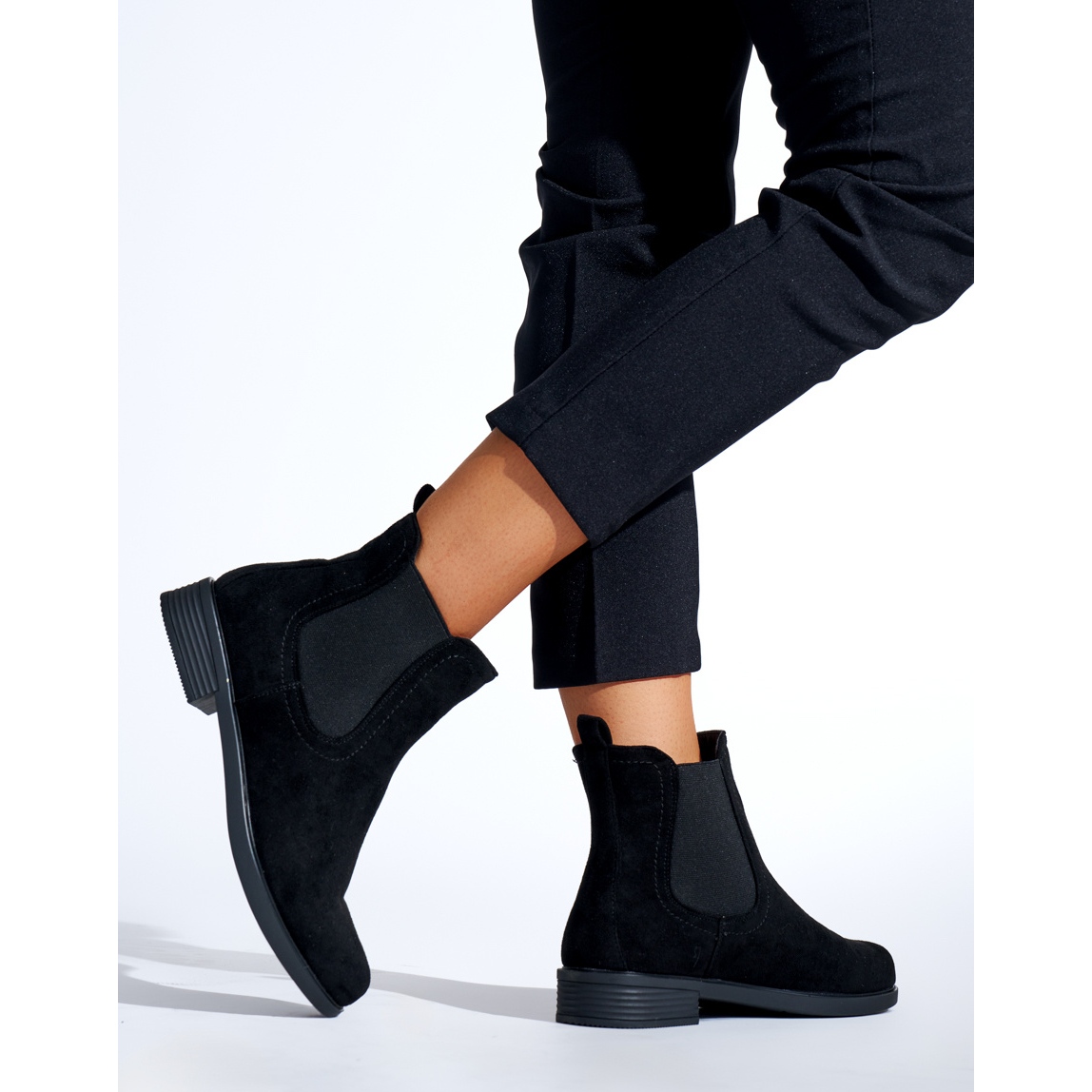 Chelats élégants en daim d'imitation (daim en cuir écologique 100%) en noir classique. Le modèle de la cheville (hauteur des 12 à 13 cm supérieurs) avec un nez arrondie et un talon plat / 3 cm cale assure la stabilité et le confort tout au long de la journée. La structure insérée (type de fixation: glissée) et un talon doux et construit facilitent l'installation et s'adaptent bien au pied. La semelle en plastique avec une poignée de garantie sur les surfaces humides, et la semelle intérieure textile et l'isolation interne fonctionneront en automne / hiver.