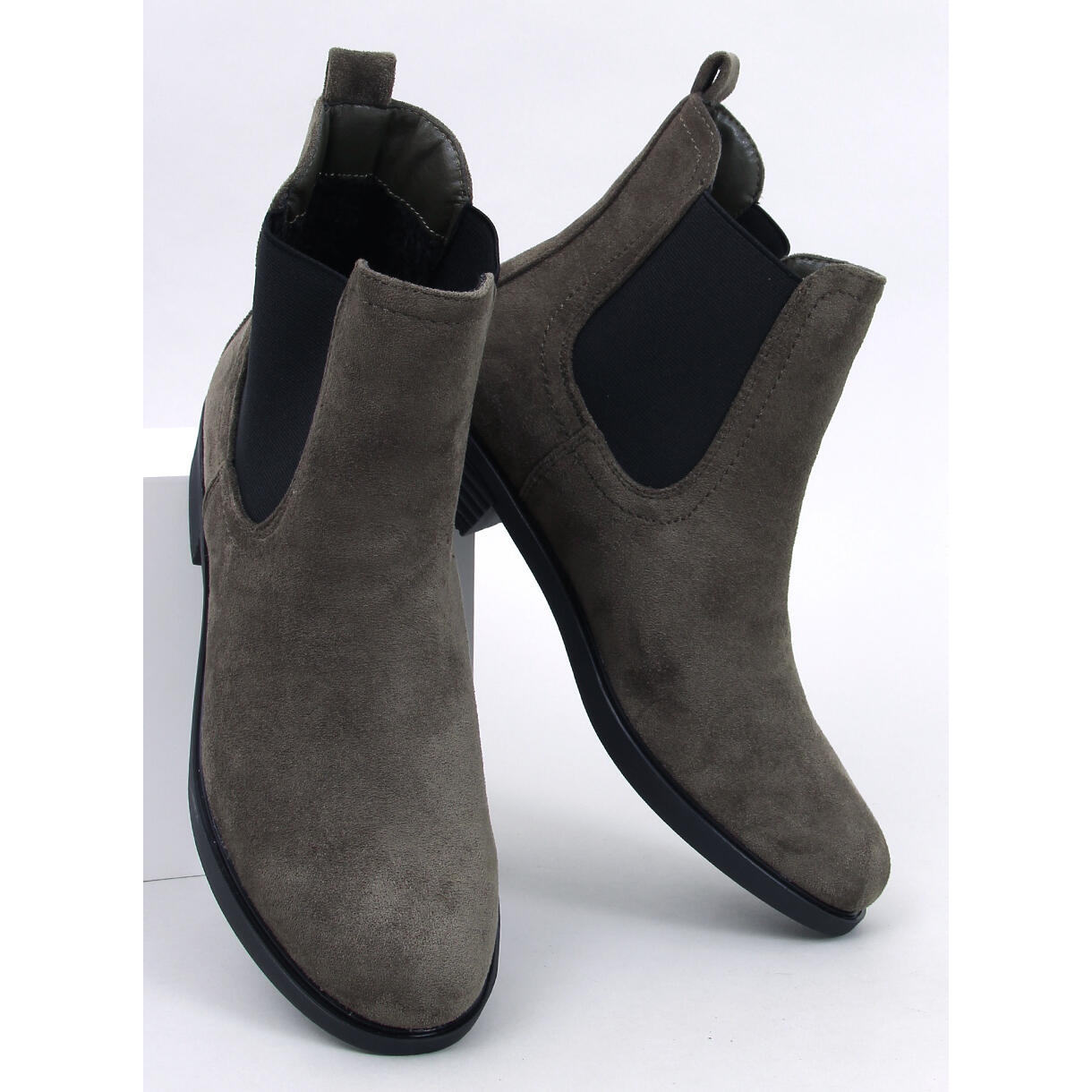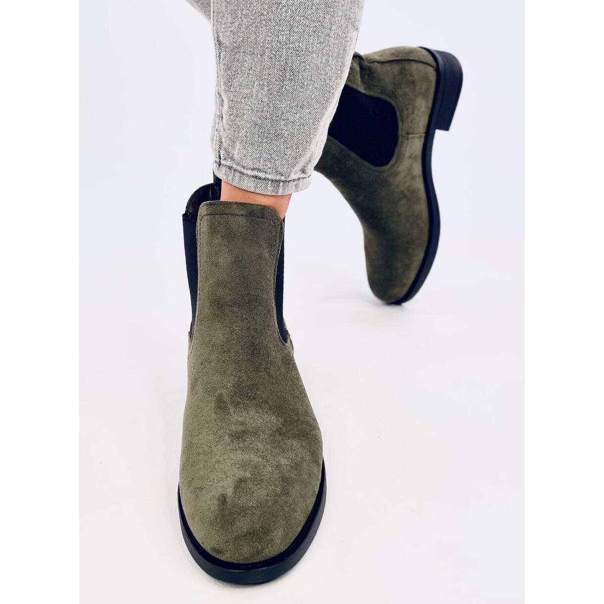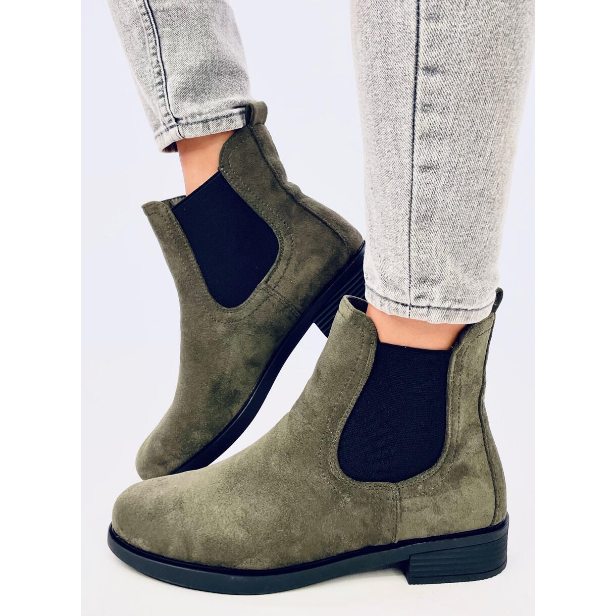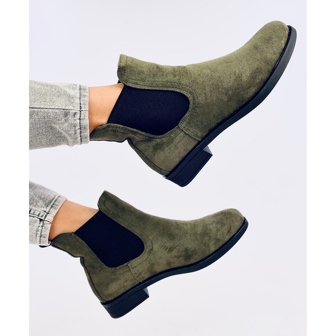 Découvrez l'élégance et le confort grâce à des bottines en daim avec élastique de couleur verte très tendance. Ces bottines classiques pour femmes à semelle plate allient les dernières tendances à la fonctionnalité du quotidien. Les inserts élastiques noirs se marient parfaitement avec la surface lisse du daim écologique, créant un look original qui attirera certainement l'attention.