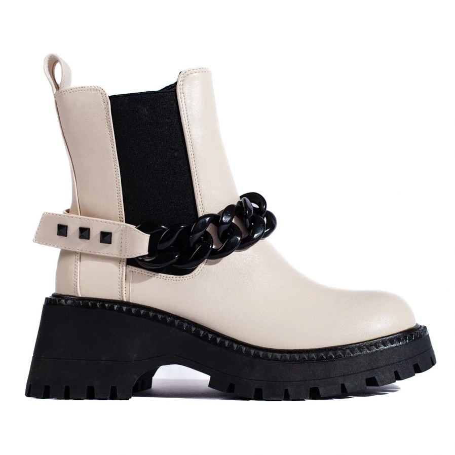 Des bottes de Chelsea féminine élégantes et universelles qui combinent un style décontracté avec des solutions pratiques pour des jours plus frais. Fabriqué en cuir écologique dans une couleur beige tamisée avec des accents noirs et une chaîne décorative, idéale pour les stylisations d'automne-hiver.