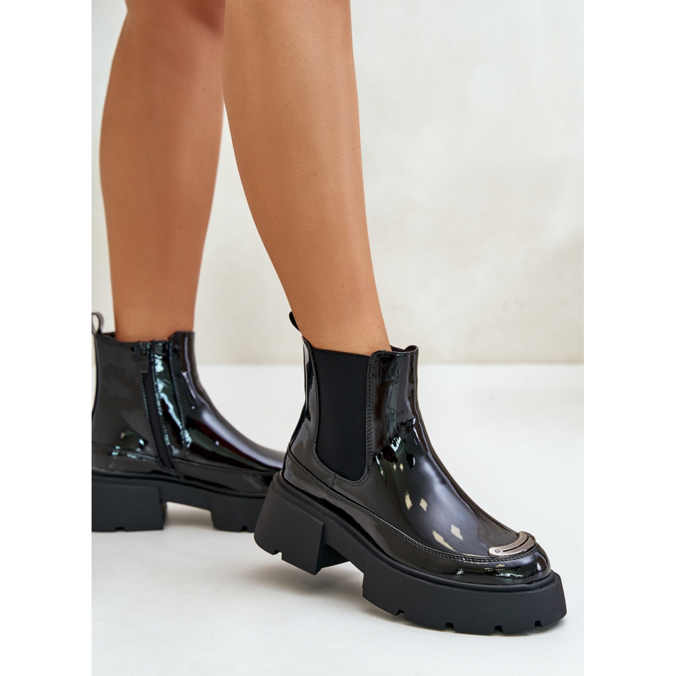 Les bottes sont placées sur une plate-forme de 4 cm de haut et un talon de 5 cm de haut, ce qui assure la stabilité et le confort lors de la marche. La hauteur de la tige de 13,5 cm leur donne une coupe de mode, atteignant la cheville.