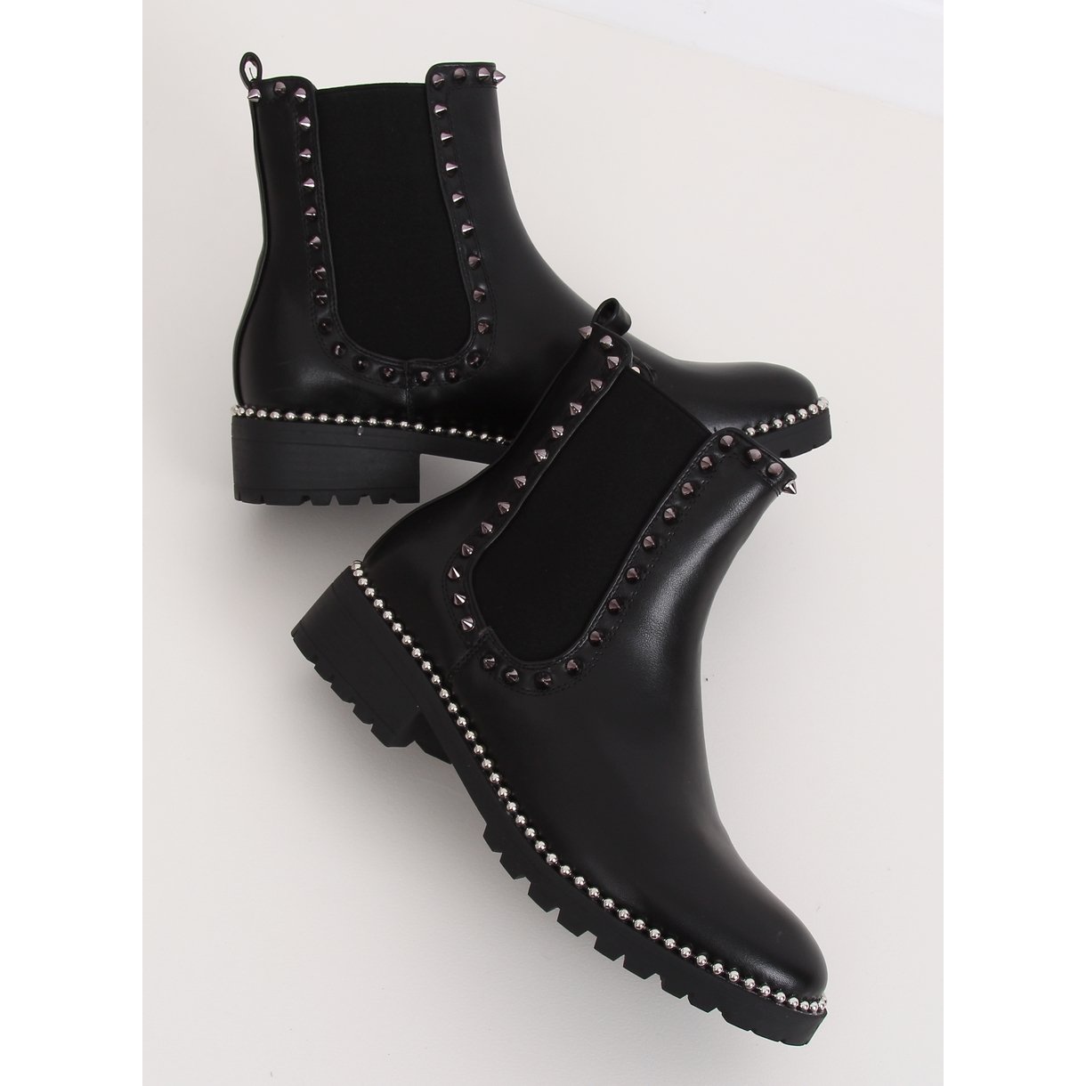 Découvrez les bottines Chelsea noires à clous pour femme NC826 Black - parfaites pour les amoureuses de la mode qui recherchent des chaussures originales et confortables au quotidien. Ces bottes accrocheuses se distinguent par une semelle trapèze qui assure une excellente adhérence et un excellent confort de port. Des perles élégantes sont placées autour de la semelle et des inserts flexibles décorés de clous ajoutent un caractère unique au modèle.