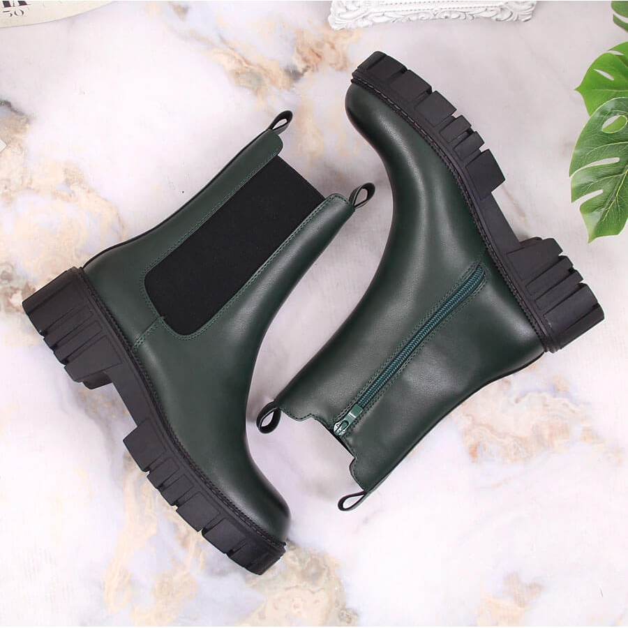 Nous vous présentons les bottines Chelsea à plateforme pour femmes, isolées en vert, de la célèbre marque Sergio Leone. Ces bottines élégantes allient design tendance et confort, ce qui en fait le choix parfait pour les journées les plus froides.