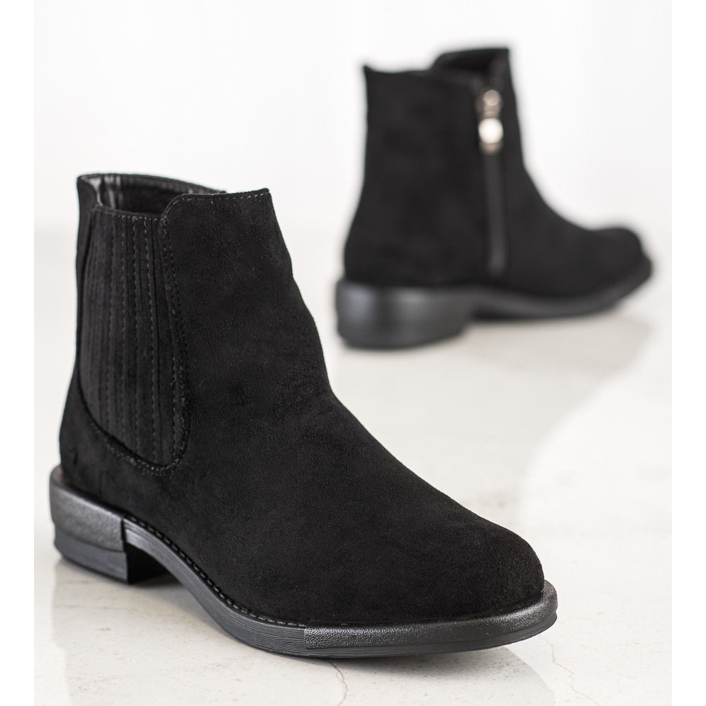 Les bottines à talons plats SHELOVET sont des chaussures uniques qui allient élégance et confort. Fabriqués en cuir écologique de haute qualité imitant le daim, ils sont extrêmement élégants et intemporels. Noir, classique, sans motifs inutiles, parfait pour un style de tous les jours.