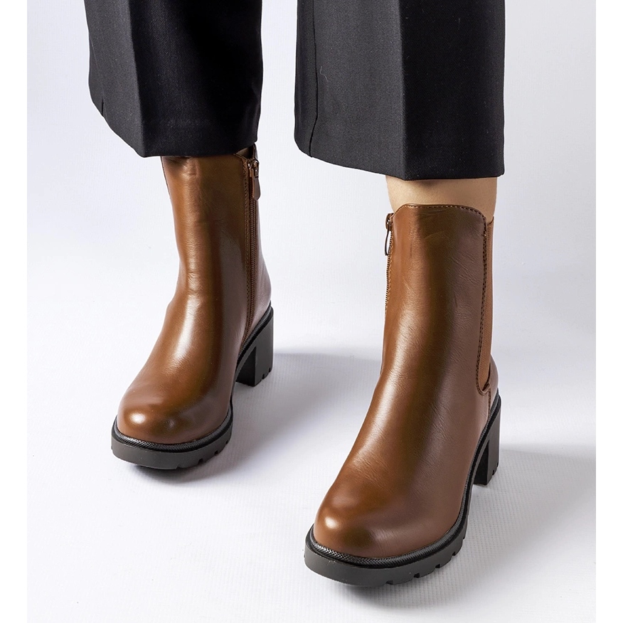 Ces étonnantes bottines ont une finition marron classique, mais moderne et élégante. Ils sont fabriqués en cuir écologique d'une couleur appelée Camel par le fabricant. Leur nez rond et leur hauteur cheville donnent un look mode et parfois légèrement prédateur. Ils sont équipés d'une fermeture éclair, ce qui facilite leur enfilage et leur retrait.