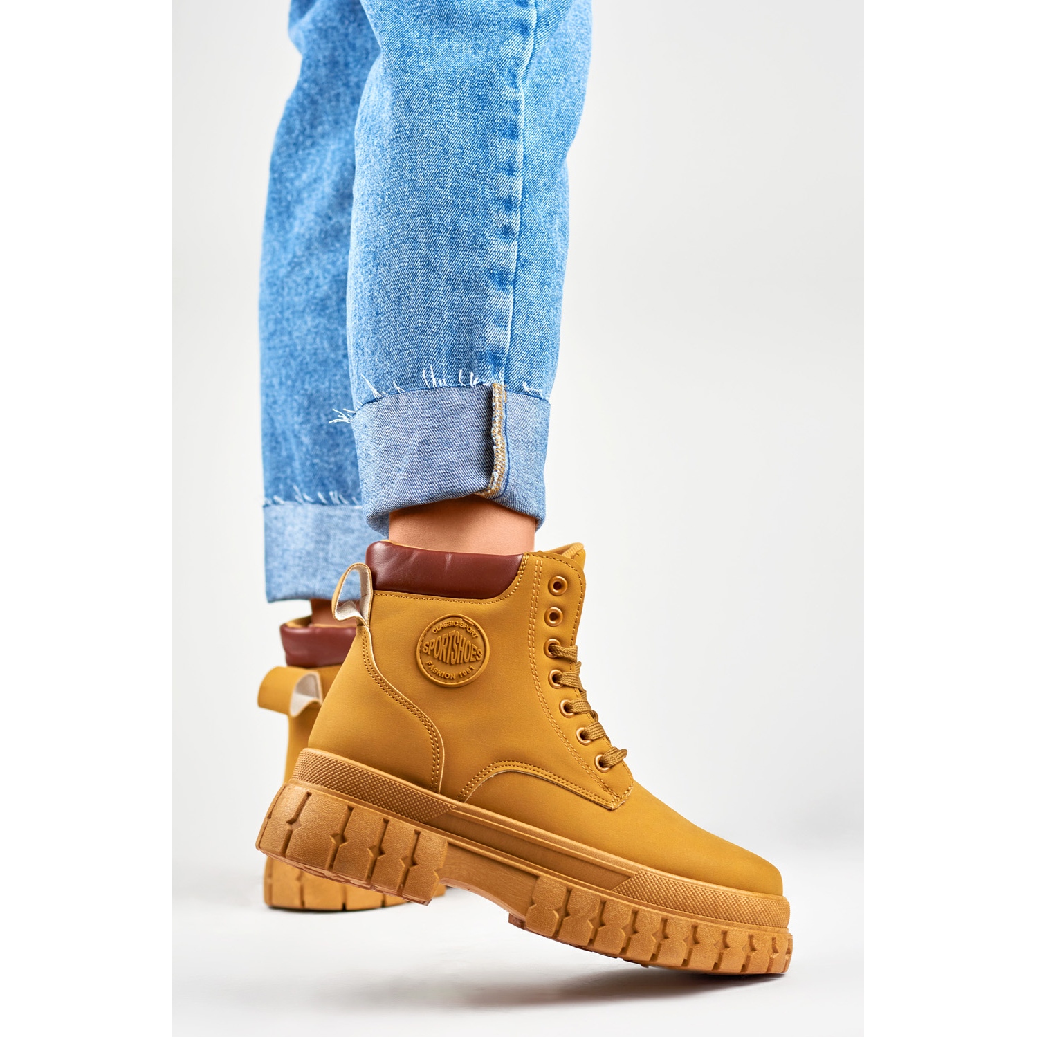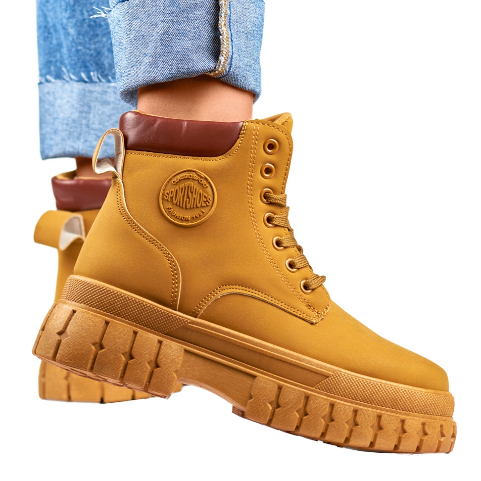 Les bottes classiques pour femmes camel (marron) sont présentées ci-dessous, produites par une autre marque. Elles appartiennent à la catégorie des bottines pour femmes. Ces chaussures sont parfaites pour la saison automne/hiver. Ils sont fabriqués en cuir écologique et leur plateforme mesure 5 cm de haut. Les bouts des bottes de trappeur sont ronds et la largeur est standard.