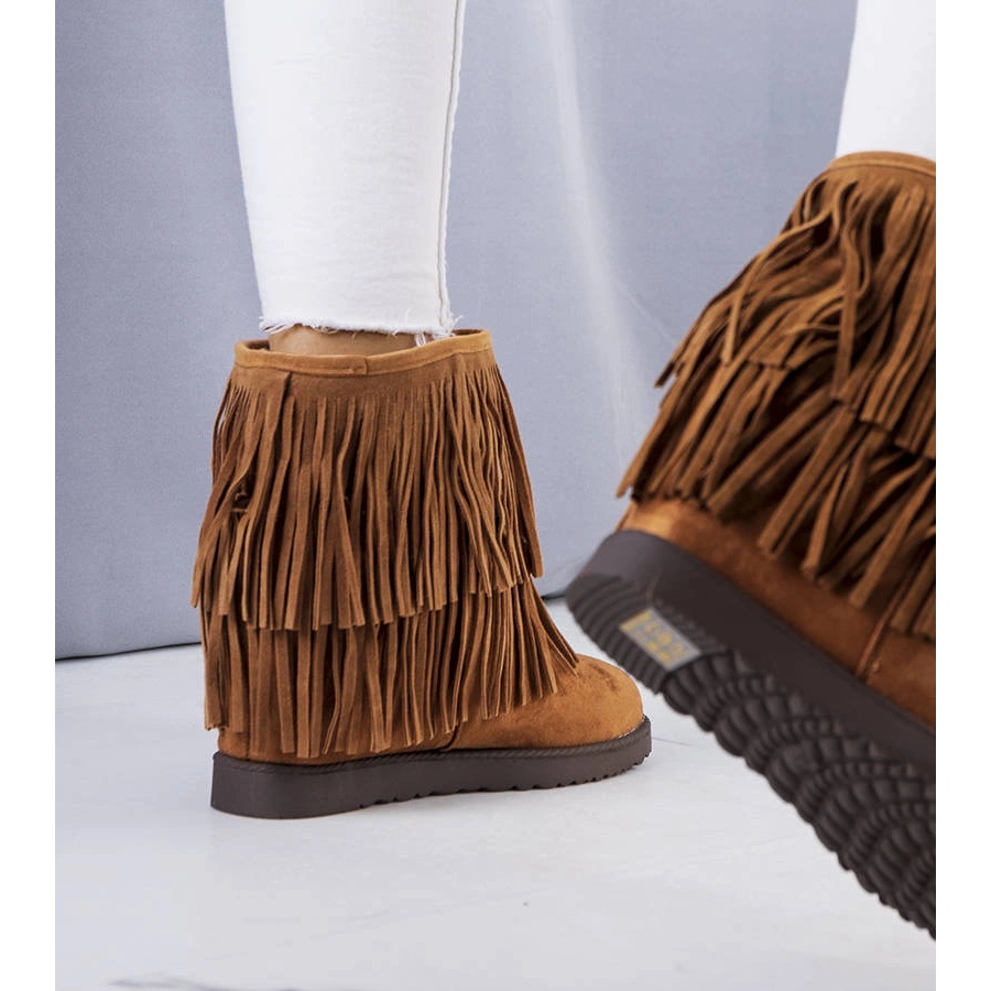Les bottines Brown Rivière sont un modèle unique de chaussures pour femmes, parfaites pour les journées plus froides grâce à l'isolation. Les chaussures sont réalisées en cuir suédé écologique de couleur camel, proposé par le fabricant. Equipé d'une cale intérieure de 8 cm de hauteur, qui ajoute de l'élégance sans perdre en confort. Un accent supplémentaire sont les franges, qui sont également une décoration de ces bottes.