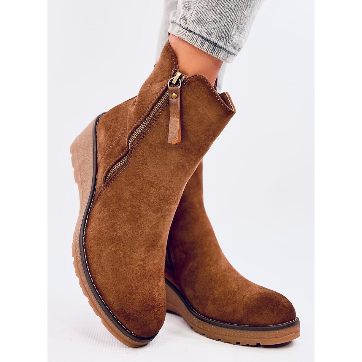 Découvrez des bottes compensées uniques dans une élégante nuance de marron kaki, qui deviendront le complément parfait à tout style de tous les jours. Fabriquées en éco-daim de haute qualité, ces bottines en daim allient style et confort. Une cale haute de 7 cm ajoute non seulement de la confiance en soi, mais affine également la silhouette.