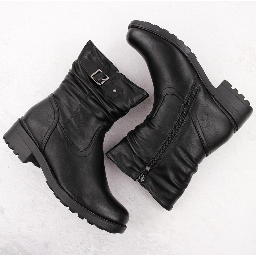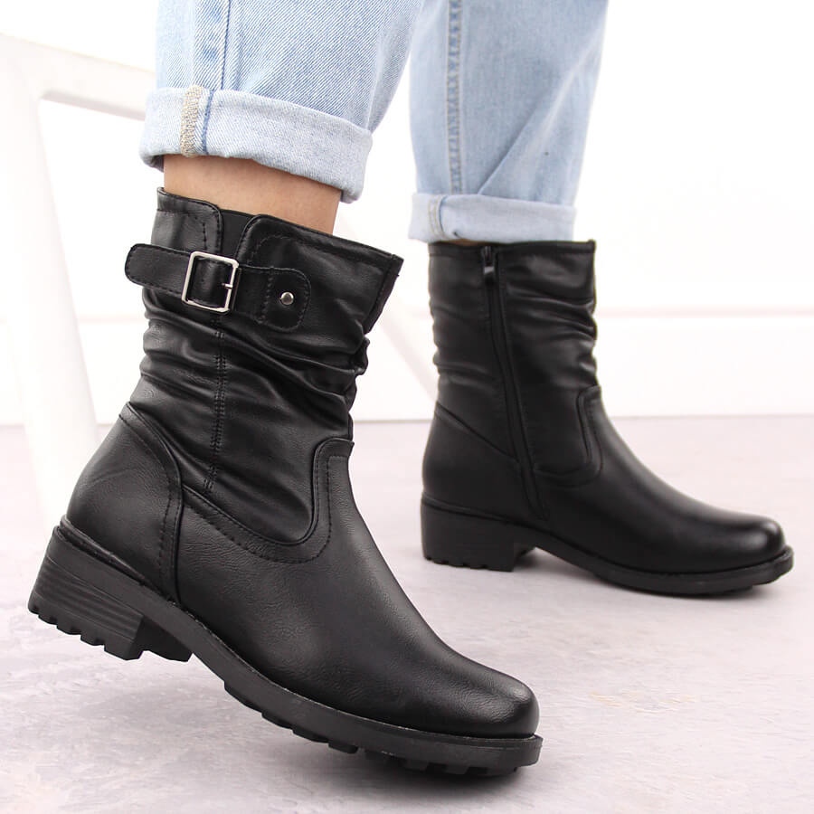 Les bottes ont un bout rond pratique et sont montées sur un talon plat de 4 cm de haut, ce qui garantit un confort au quotidien. La hauteur supérieure d'environ 17,5 cm permet au modèle de bien protéger les chevilles et la fermeture éclair facilite l'enfilage et le retrait des chaussures. La fourrure intérieure assure chaleur et confort d'utilisation, parfaite pour les journées d'hiver et d'automne.