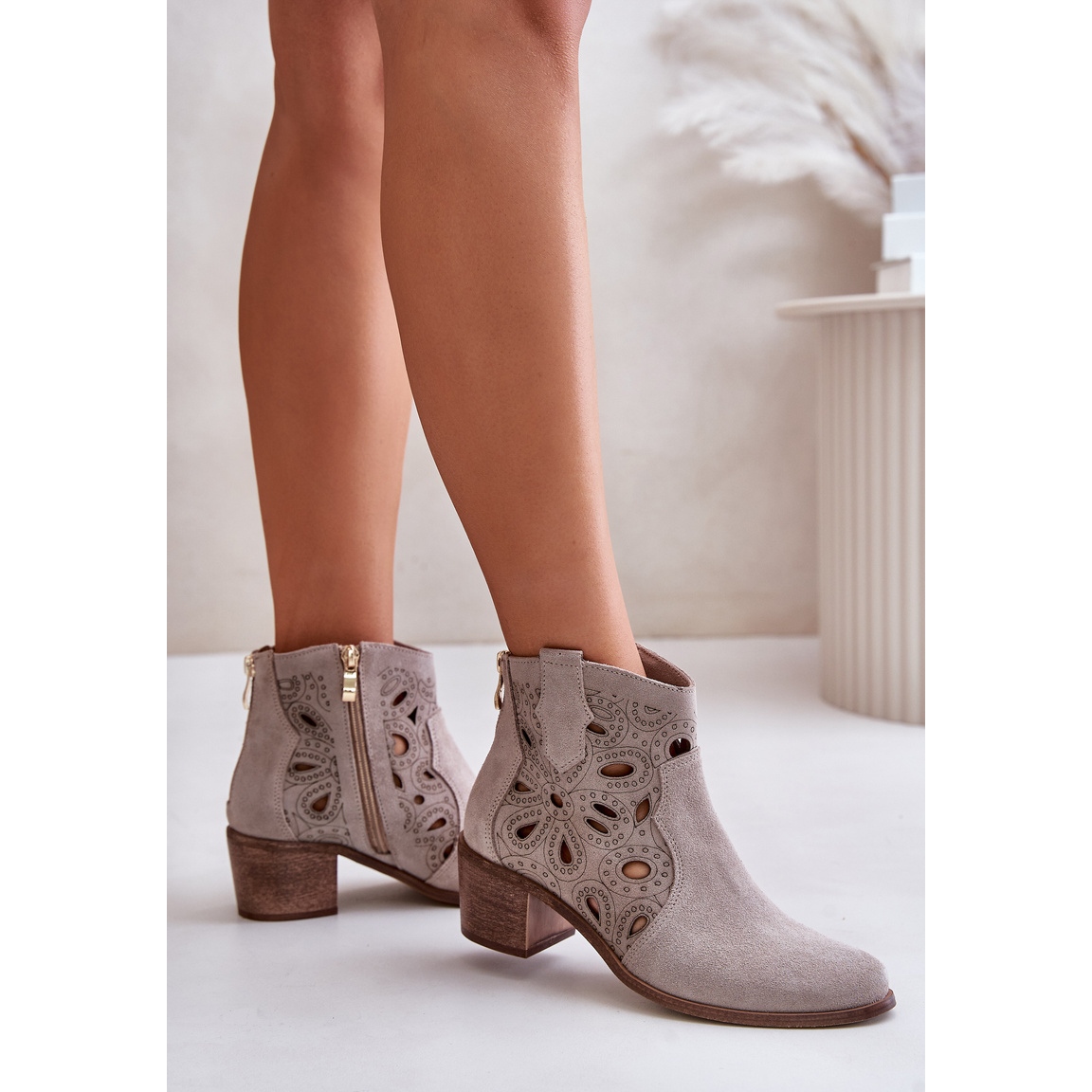 Les bottes ont un bout arrondi et une hauteur supérieure confortable, atteignant au-dessus de la cheville, ce qui offre un soutien adéquat aux pieds par temps froid. Une fermeture éclair sur le côté facilite l'enfilage et le retrait, ce qui ne fait qu'augmenter le confort d'utilisation. Grâce au motif ajouré qui décore la tige, les bottines ajoutent une note de fraîcheur et de légèreté à votre look.