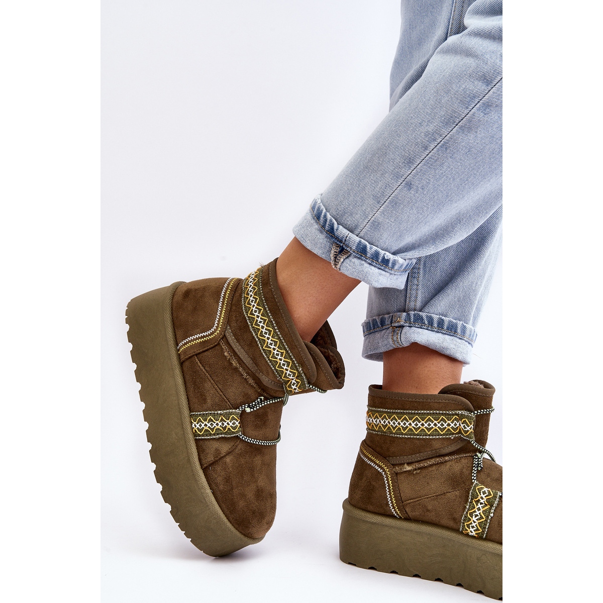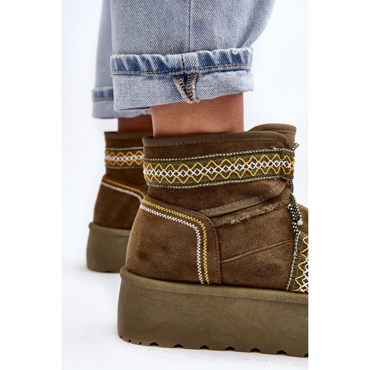 Le produit décrit est des bottes de neige vertes pour femmes. Ils attirent l'attention non seulement par leur couleur, mais aussi par leur motif tendance et original sur le thème aztèque. Ils sont fabriqués en suède écologique, ce qui les rend doux et confortables à porter.