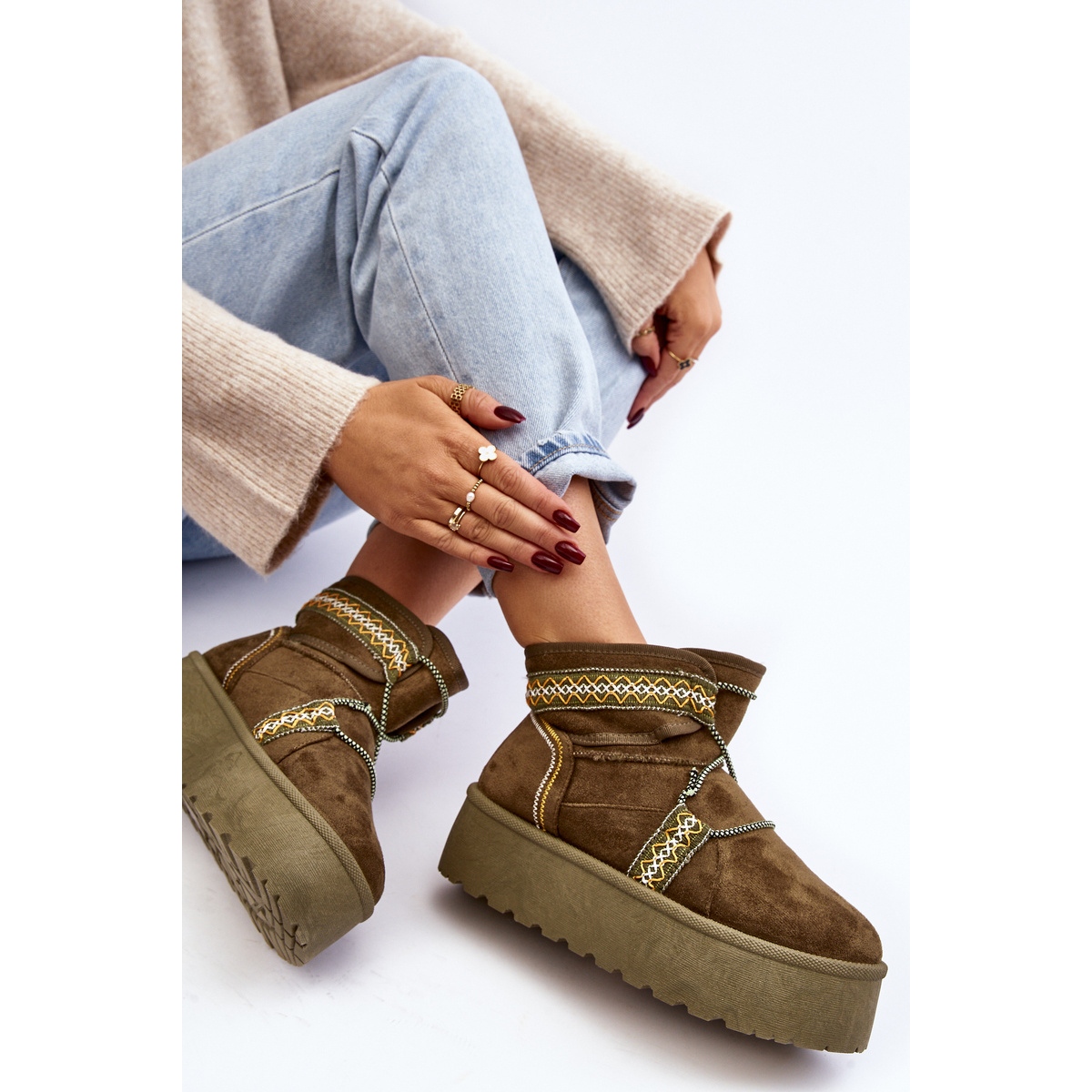 Leur plus grand avantage est sans aucun doute la semelle épaisse en caoutchouc, qui isole efficacement le pied du sol froid. La hauteur de la semelle peut atteindre 5 cm, ce qui ajoute du caractère à ces chaussures et ne les prive pas de confort. La semelle est de la même couleur que le reste de la chaussure, créant un ensemble uniforme.