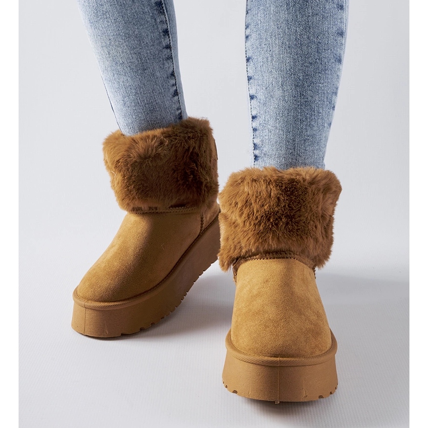 - Coupe à la mode: daim écologique de chameau avec de la fourrure et un arc rend les chaussures parfaitement complétant les stylisations hivernales - du décontracté à plus féminine.