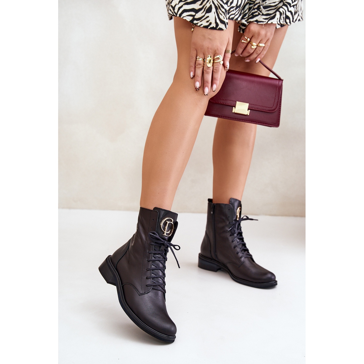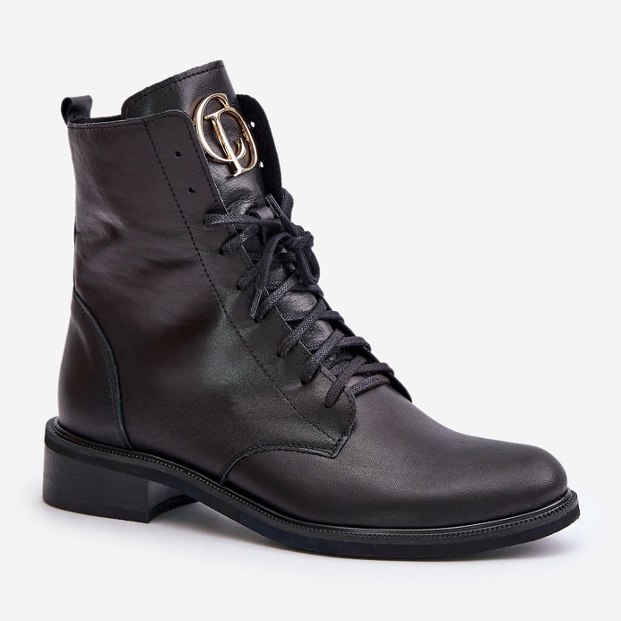 Les bottes ont une fermeture éclair et un laçage supplémentaire, ce qui vous permet de correspondre parfaitement au pied, offrant un confort tout au long de la journée. Le détail doré placé sur la langue leur donne un peu de splendeur et les fait se démarquer des autres modèles. Grâce au talon plat avec une hauteur de 3,5 cm, vous pouvez y marcher longtemps et confortablement, profiter de chaque instant.