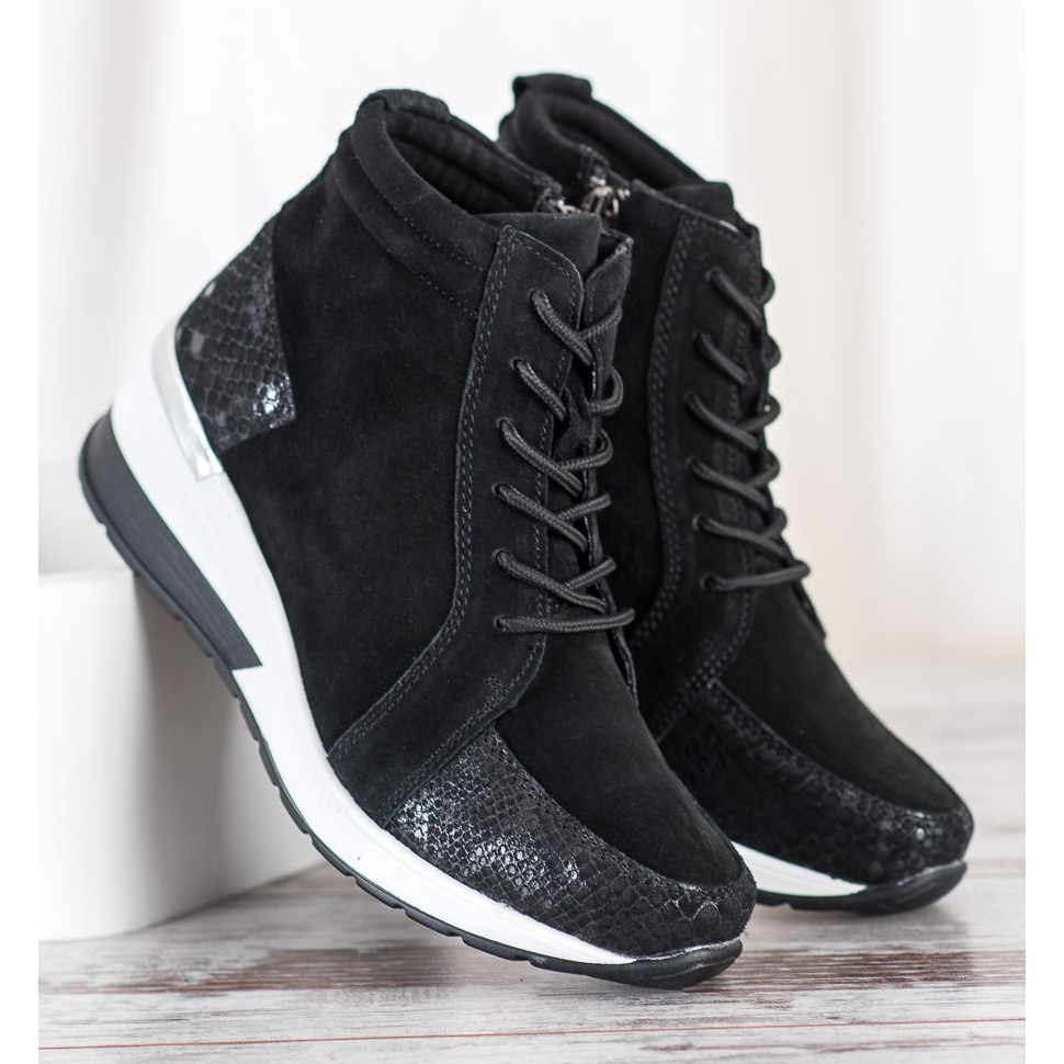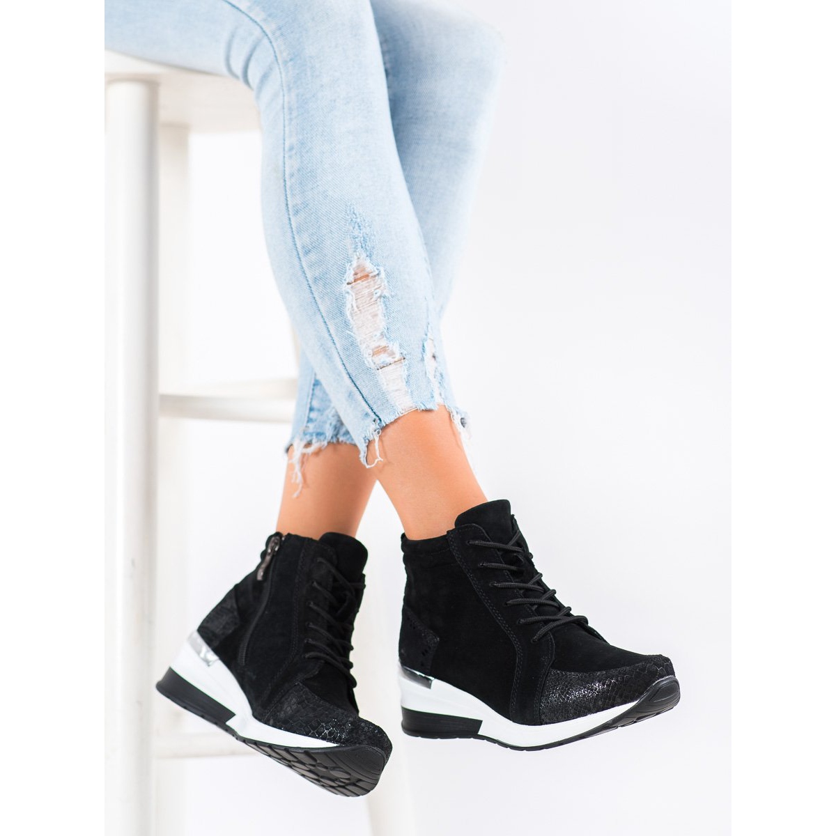 Grâce au laçage et à la fermeture éclair, les bottines s'ajustent parfaitement à la jambe, et leur talon rapporté et souple souligne l'esthétique de l'ensemble. De plus, ce modèle ne nécessite pas d’isolation, ce qui en fait un choix idéal pour la mi-saison. Sans motif, dans des coloris noirs classiques, ces bottines deviendront certainement un élément universel de votre garde-robe.