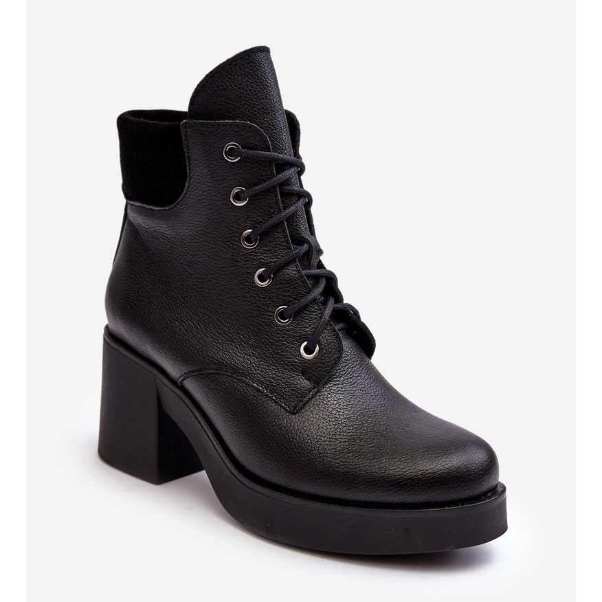 Des bottes de femmes noires classiques en cuir naturel de haute qualité. Le modèle de cheville conçu pour le confort et la stabilité - intégrés sur un poteau de 8 cm de haut avec une plate-forme de 2,5 cm de haut. L'intérieur est légèrement isolé avec une couverture de chaussures, parfait pour la saison automne / hiver. La fixation pour une serrure latérale plus un laçage pratique vous permet de faire correspondre la tige au pied. Le talon raidi et l'orteil rond garantissent le confort lors d'un usage quotidien.