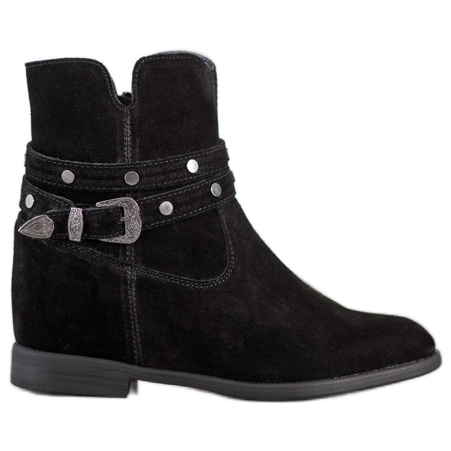 Les bottines se caractérisent par une cale cachée de 8 cm de haut, qui souligne la silhouette féminine et assure le confort de marche. Le bout rond et l'isolation interne en font un choix parfait pour les journées les plus froides de la saison automne-hiver. L'intérieur en matière textile garantit un confort et une ventilation adéquate du pied.