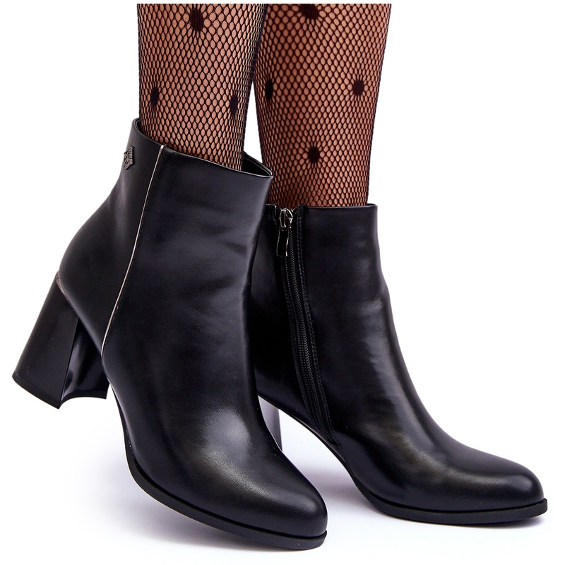 Des bottes élégantes et intemporelles sur un poste stable, parfaite pour la saison automne / hiver. Fabriqué en cuir écologique de haute qualité, avec une isolation à partir d'une couverture de chaussures - ils fournissent un confort thermique et une apparence élégante quotidiennement et la production. Une décoration subtile en haut et un élément miroir au-dessus du talon leur donne un caractère unique.