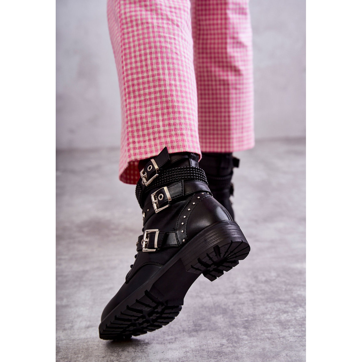 Des bottes noires élégantes en cuir écologique de haute qualité. La supérieure décorée avec des rayures réglables avec des boucles, des goujons et des zircons qui ajoutent du caractère et de l'éclat subtil. Le modèle s'est fixé avec une fermeture à glissière et en outre, grâce à ce qu'il s'adapte parfaitement au pied. L'intérieur bordé d'une couverture de chaussures souples offre de la chaleur et du confort les jours plus frais. Une plate-forme délicate et un talon plat avec une hauteur d'environ 3,5 cm de stabilité de garantie à chaque étape. Les bottes atteignent la cheville et ont un nez arrondi.