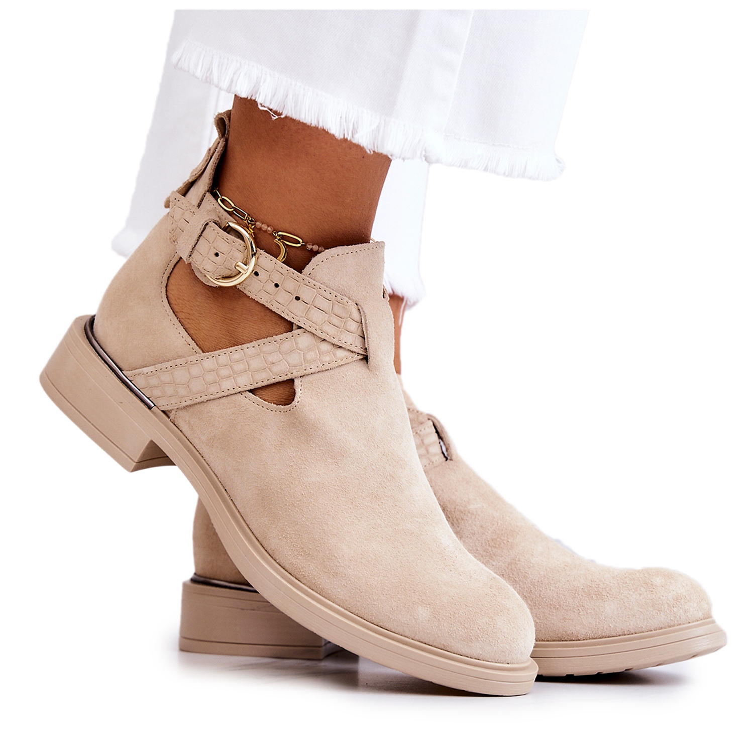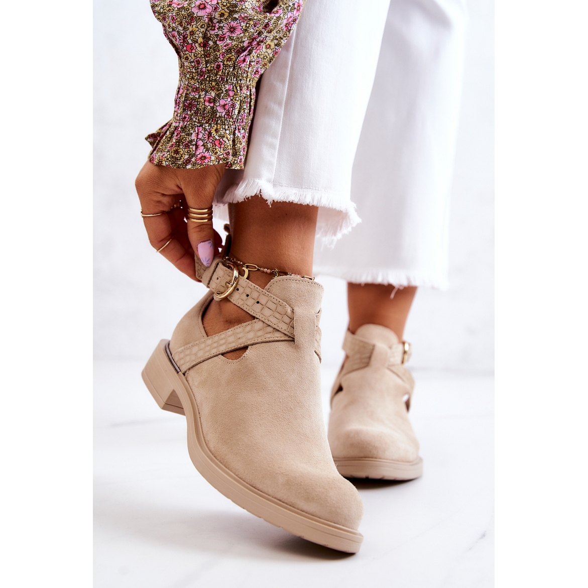 Les bottes se distinguent par leur coupe tendance et les découpes phénoménales sur les côtés de la tige les rendent légères et modernes. La sangle réglable fermée par une boucle permet un ajustement parfait au pied, ce qui augmente le confort d'utilisation. Un talon plat de 3,5 cm assure la stabilité, ce qui fait de ces bottes un choix idéal pour tous les jours et diverses occasions.