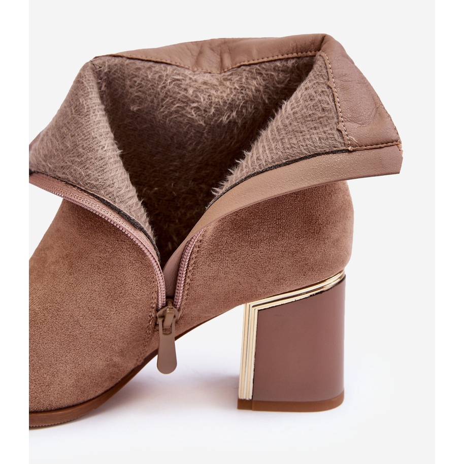 Bottines à talons hauts en daim avec décoration beige Dwinja sont des chaussures beiges pour femmes avec un talon bloc. Ils sont exceptionnellement élégants grâce à la décoration de bijoux appliquée. La tige arrive au-dessus de la cheville et les bottes sont fermées par une fermeture éclair à l'intérieur. Un élément unique est l'élément miroir sur le talon.