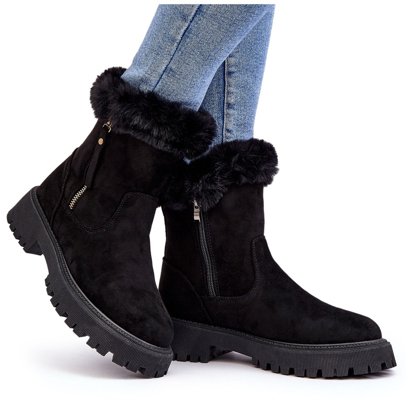Le produit est une paire de bottes pour femmes de la marque PE1, parfaites pour les journées froides grâce à la fourrure chauffante. Les bottes sont noires et en cuir suédé écologique. Une fermeture éclair décorative sur le côté de la tige leur donne un style unique, et la deuxième fermeture éclair facilite l'enfilage des chaussures. Ce modèle est fortement isolé avec de la fourrure à l'intérieur, ce qui sera certainement un gros plus lors des journées froides.