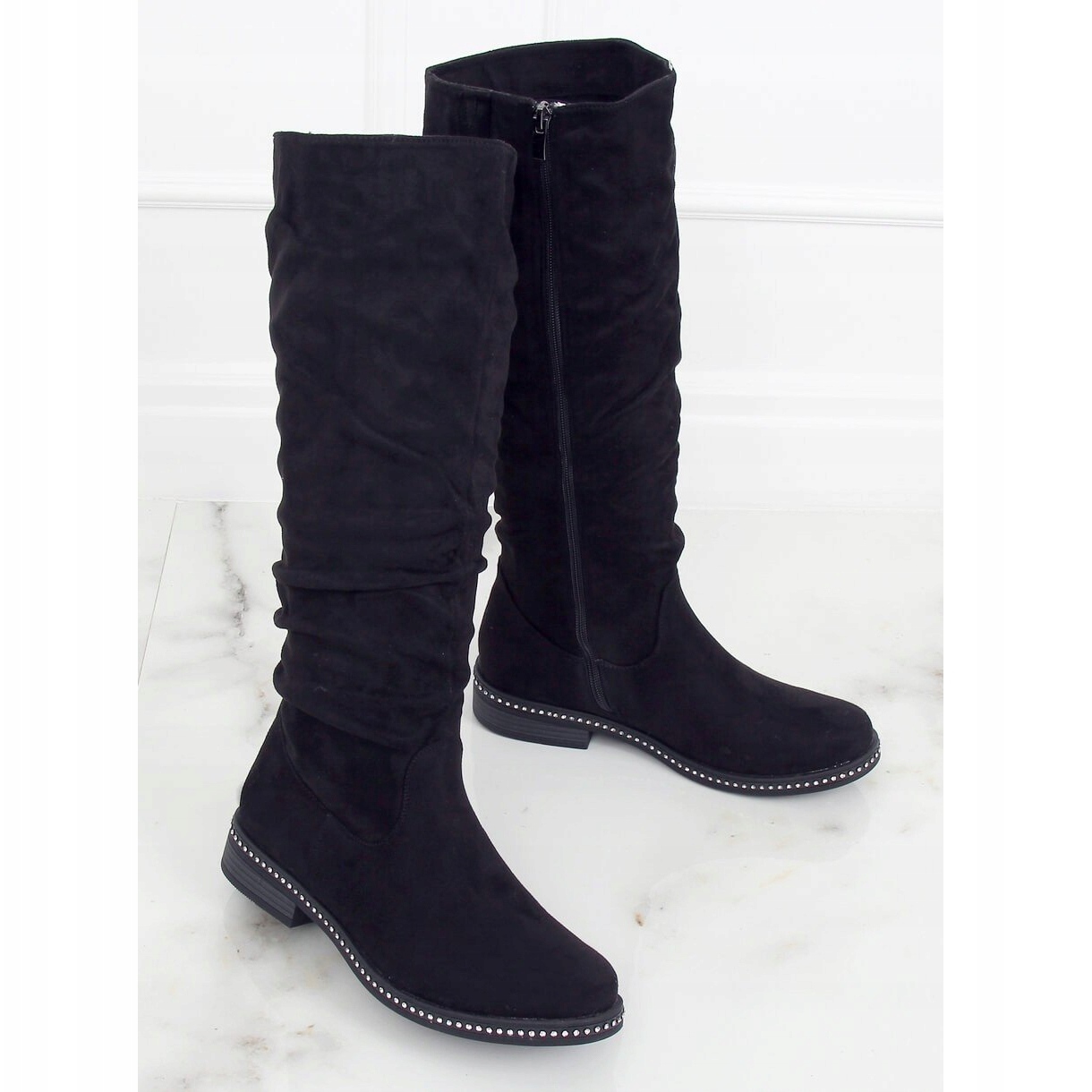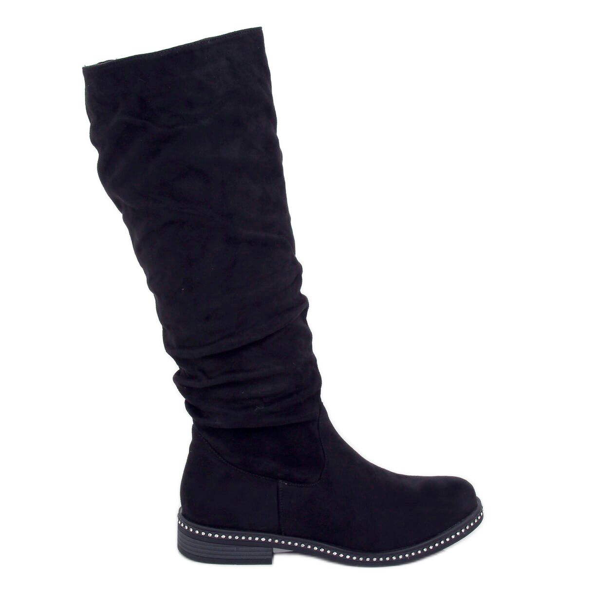 Les bottines en daim noir sont un classique parfait pour un usage quotidien – parfaites avec des jeans, des leggings et des robes. La tige montant jusqu'aux genoux et le talon plat de 3 cm garantissent un confort de port optimal, et le bout rond ajoute de la subtilité. De plus, les strass décoratifs sous forme de pierres permettent à ces chaussures d'attirer facilement l'attention et d'enrichir n'importe quel style.