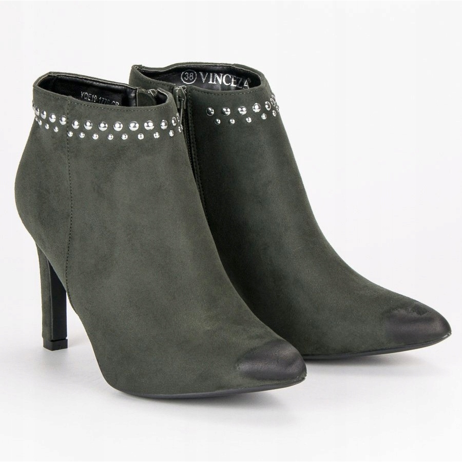 Les bottines à talons hauts en daim vert Vinceza sont un choix parfait pour les femmes à la recherche de chaussures élégantes pour la saison automne et hiver. Fabriquées en daim écologique de haute qualité, ces bottines élégantes attirent l'attention grâce à leur teinte unique et leurs subtiles décorations sous forme de strass sur le dessus de la tige.