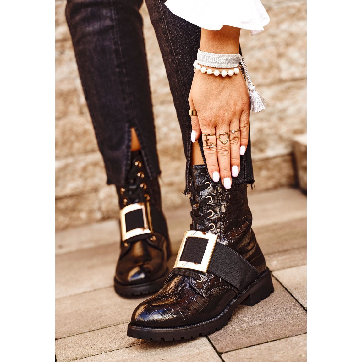 Découvrez des bottines pour femmes uniques avec une boucle Happy Su dans une élégante teinte noire avec des accents dorés. C'est la combinaison parfaite de style et de fonctionnalité qui attirera certainement l'attention. Fabriquées en cuir écologique de haute qualité, ces bottines sont non seulement à la mode, mais aussi respectueuses de l'environnement.