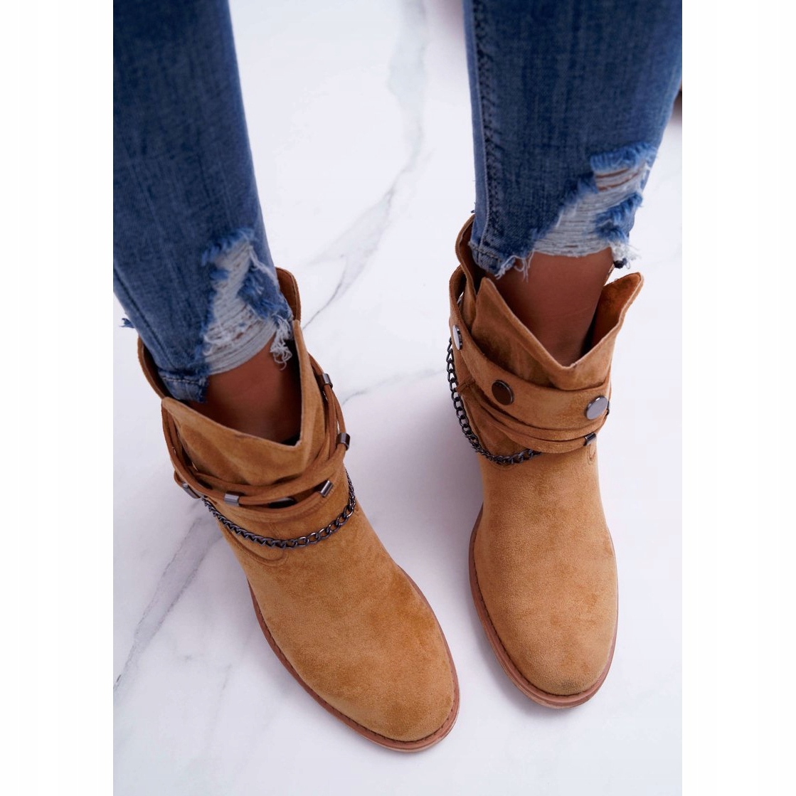 Le design distinctif avec des décorations subtiles sous forme de chaînes et de rayures leur donne du caractère, et la possibilité de retirer les décorations leur permet d'être facilement assortis à une variété de styles - des tenues de tous les jours aux tenues plus élégantes. Grâce à la cale haute (6 cm), les bottes allongeront non seulement optiquement les jambes, mais assureront également la stabilité à chaque pas.