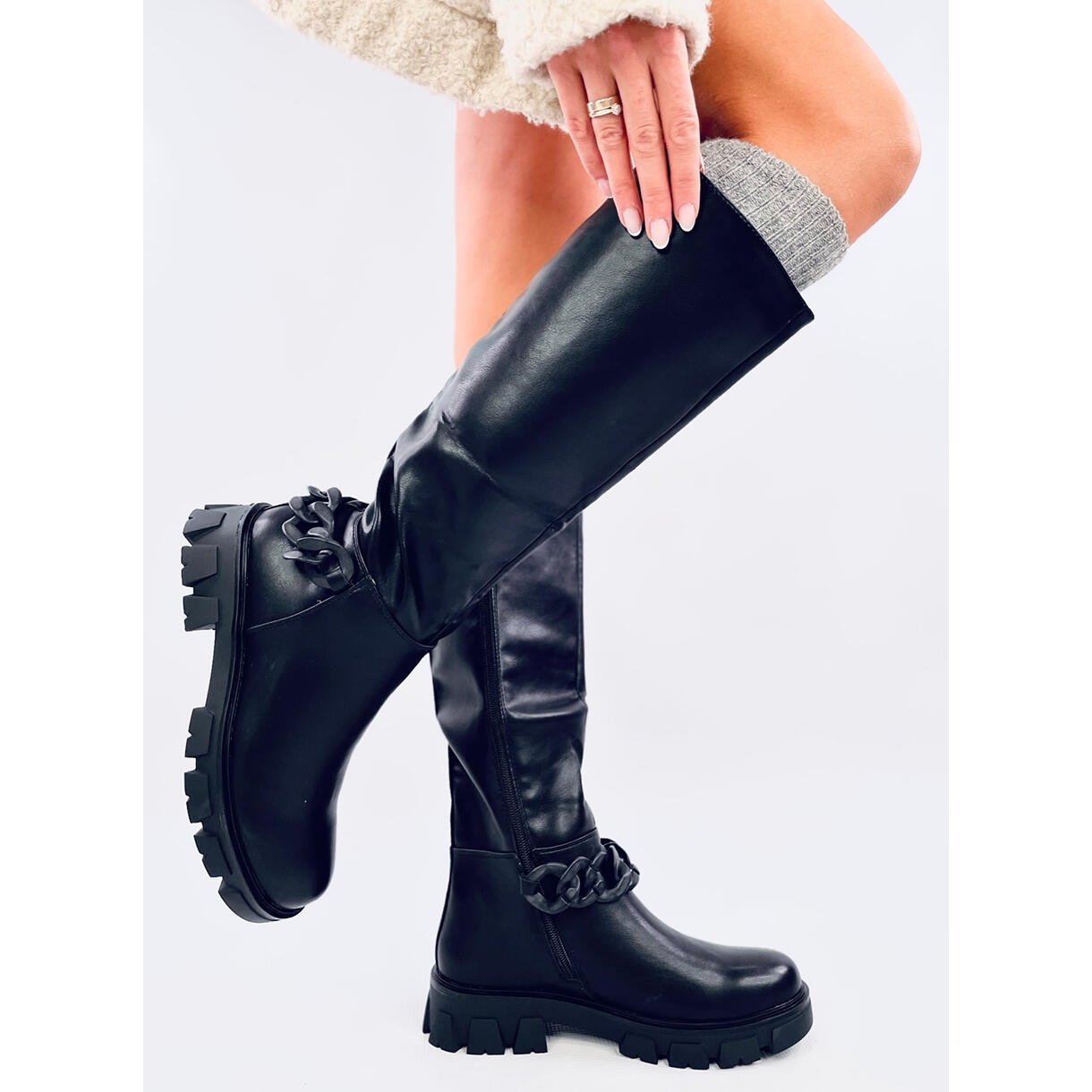 Rencontrez des bottes pour femmes avec une chaîne noire invitée - une combinaison parfaite de style et de confort! Ces bottes élégantes sur une semelle haute seront un complément parfait à chaque stylisation quotidienne, et leur design minimaliste les mélangera facilement dans vos tenues.