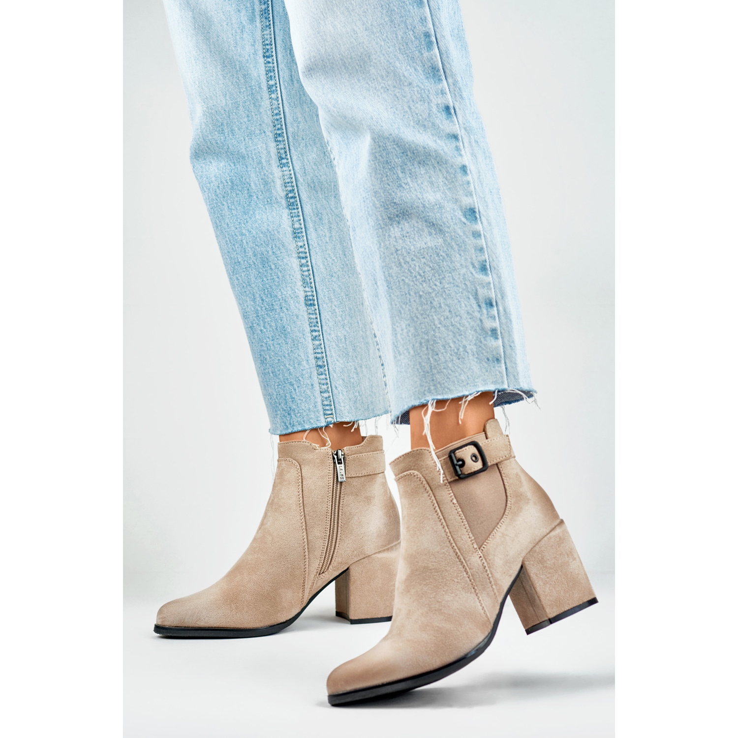 Il s'agit de bottines pour femme dans une teinte beige clair, proposées par la marque « Inna Marka ». Les chaussures font partie de la ligne "KeeShoes". Les bottes sont conçues spécialement pour la saison automne/hiver. La tige des chaussures est en daim écologique, offrant un look élégant. Le matériau extérieur est du cuir écologique en daim.