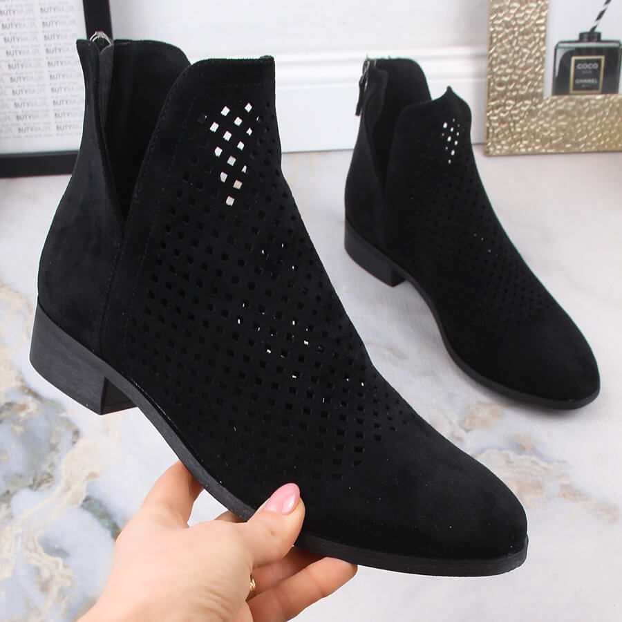 Les bottes sont fabriquées en cuir écologique noir profond de haute qualité, ce qui les rend non seulement à la mode, mais aussi respectueuses de l'environnement. Les motifs ajourés ajoutent légèreté et originalité, ce qui en fait un choix idéal pour les journées de printemps et d'automne. Dotées d'un talon plat de 3 cm, elles assurent un confort de port tout au long de la journée, et leur tige arrivant au-dessus de la cheville stabilise le pied.