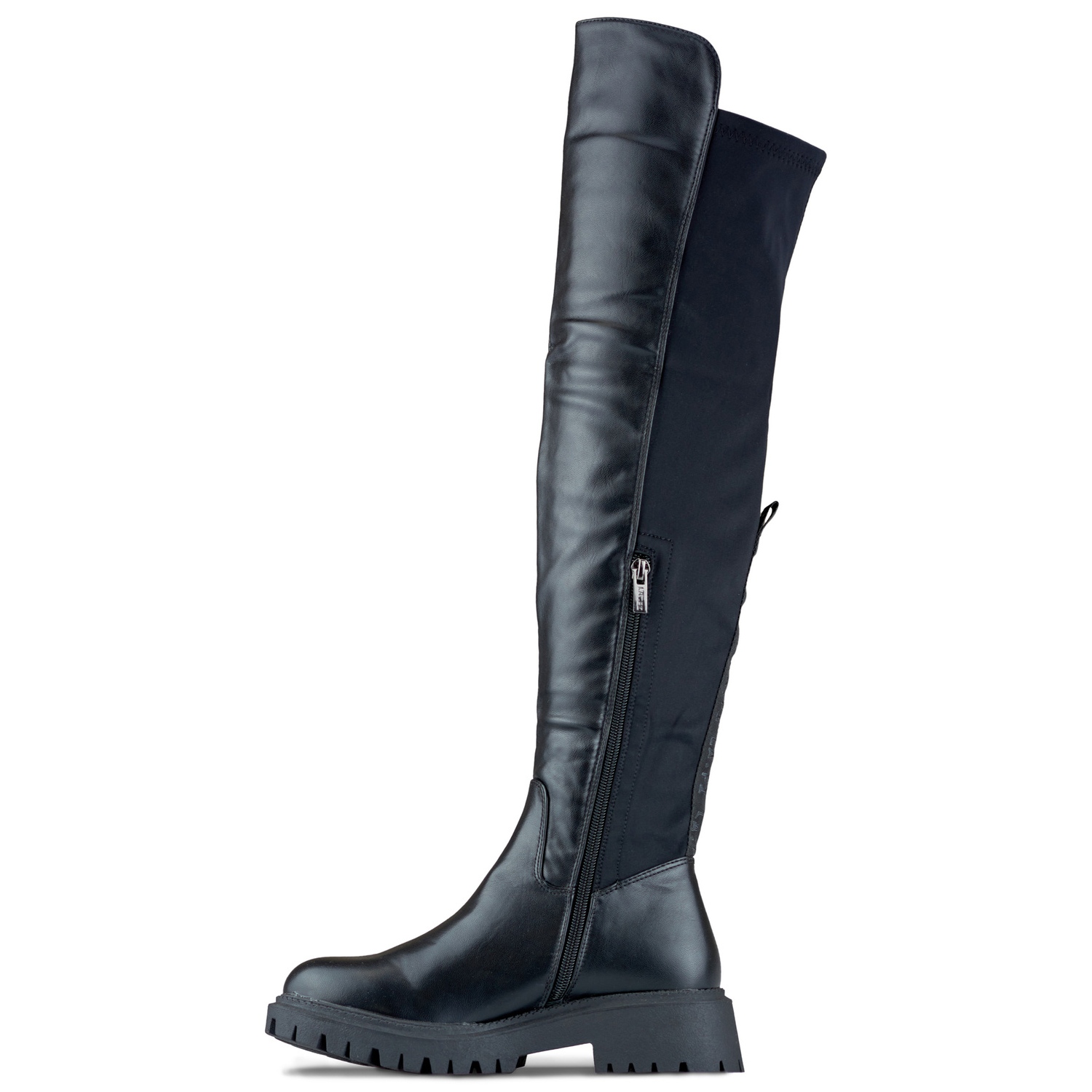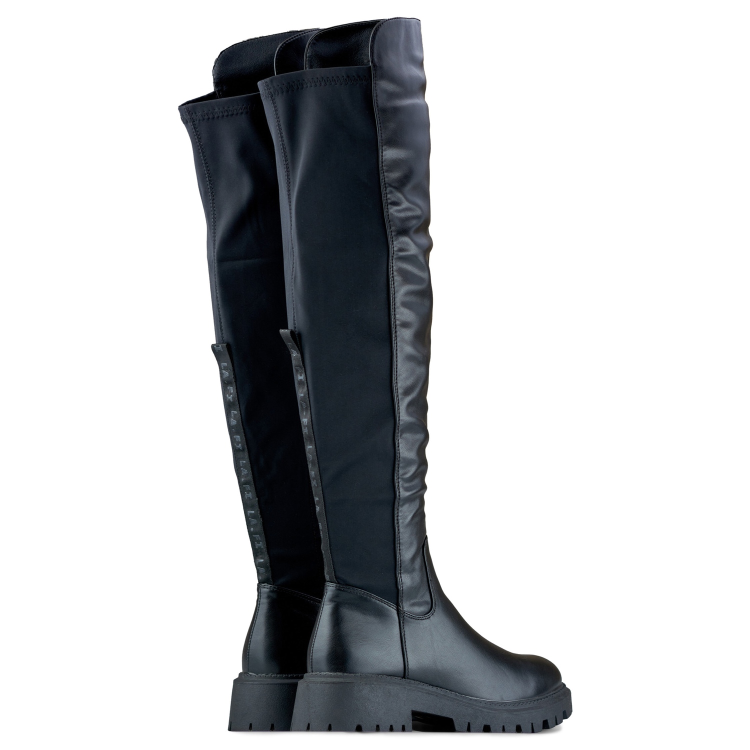 Les chaussures sont fabriquées en cuir écologique et en Lycra dont l'élasticité assure un ajustement parfait à la jambe. La tige des bottes mesure 50 cm de haut, ce qui signifie qu'il s'agit de modèles mousquetaires, arrivant au-dessus du genou. Le style des chaussures est classique, sans décorations ni motifs supplémentaires.