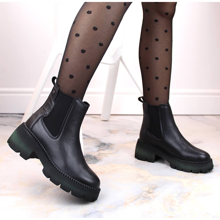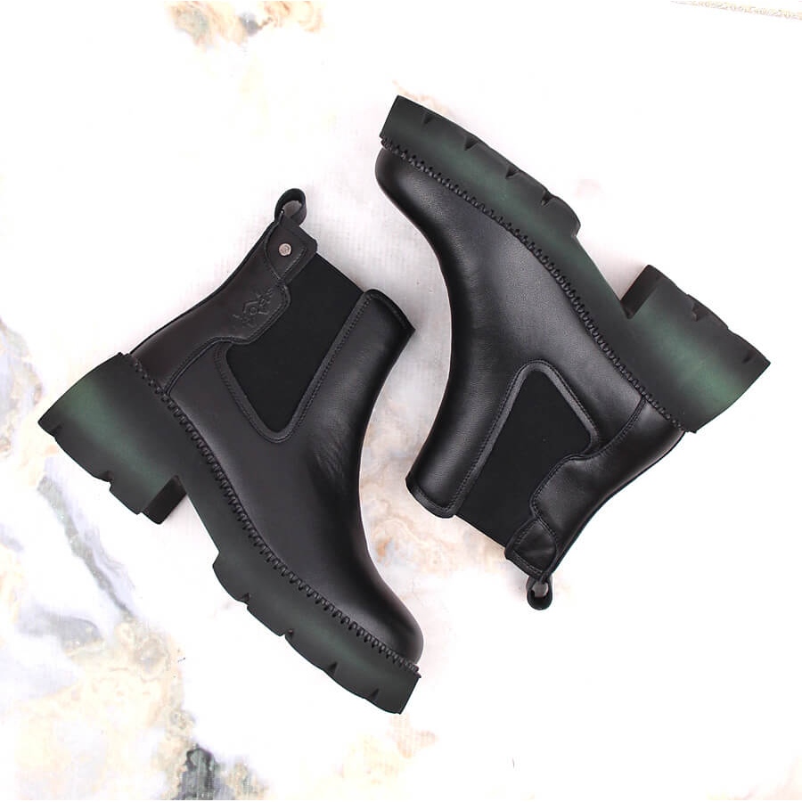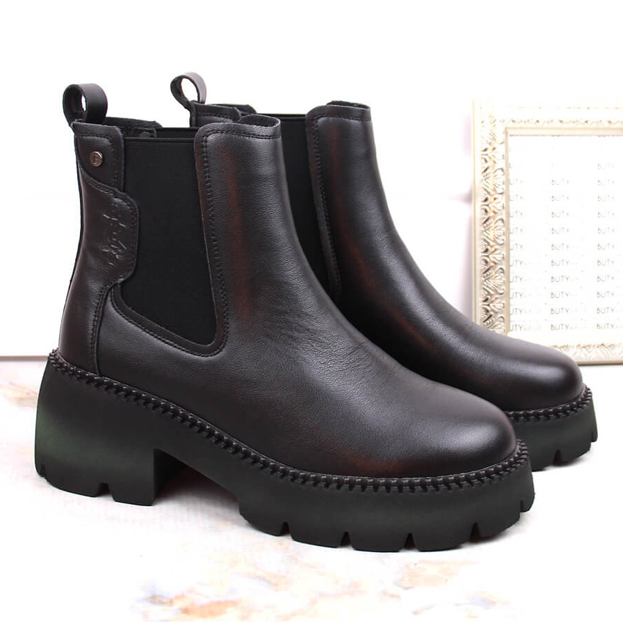 Les bottes sont en cuir naturel, ce qui garantit la haute qualité et la durabilité du produit, et la semelle est en matière synthétique. L'intérieur des chaussures est doublé de fourrure, ce qui les rend légèrement isolées – parfaites pour les journées les plus froides de l'automne à l'hiver. L'insert est également en fourrure, offrant un confort de port supplémentaire.