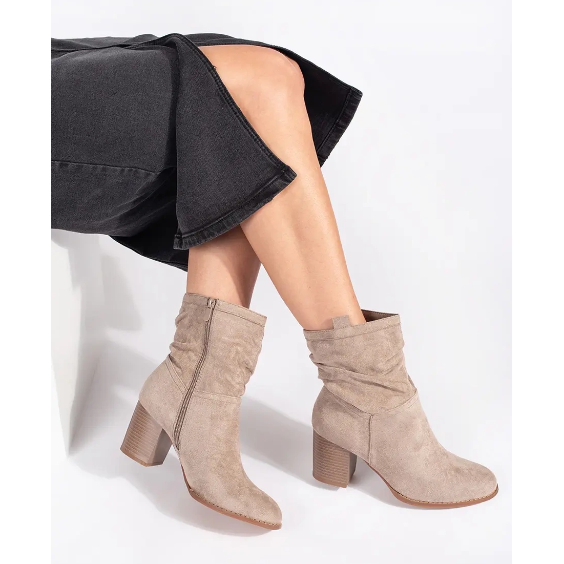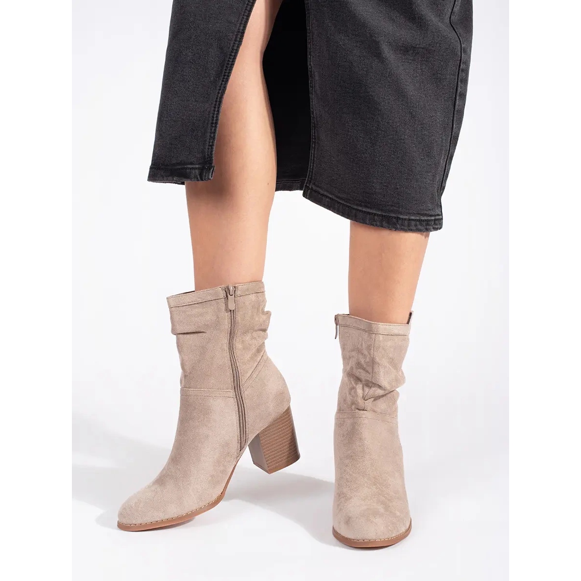 Fabriquées en cuir suédé écologique, les bottes sont exceptionnellement attrayantes et leur couleur beige s'intègre parfaitement dans les tendances. La fermeture éclair facilite l'enfilage et le retrait rapide des chaussures, et le talon recouvert assure stabilité et confort. Un bout rond et une semelle en plastique lisse soulignent leur look moderne.