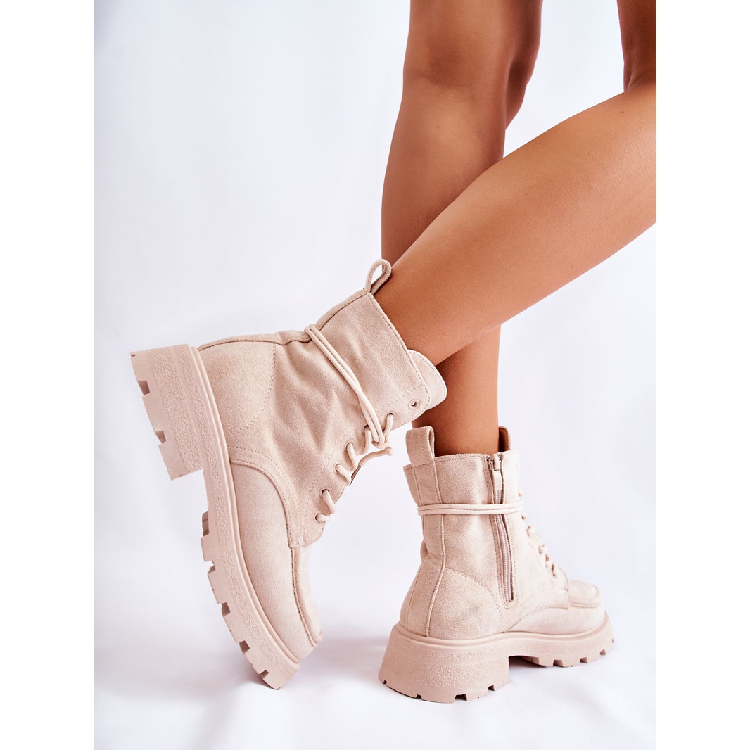 Les bottines à nouer en daim beige pour femme sont un incontournable de la garde-robe de chaque femme. Fabriqués en éco-daim doux, ils allient parfaitement style et confort. Le modèle classique avec une tige arrivant au-dessus de la cheville a été enrichi d'une fermeture éclair pratique sur le côté, qui facilite l'enfilage et le retrait des chaussures. De plus, le système de laçage permet un ajustement précis à la largeur des jambes.