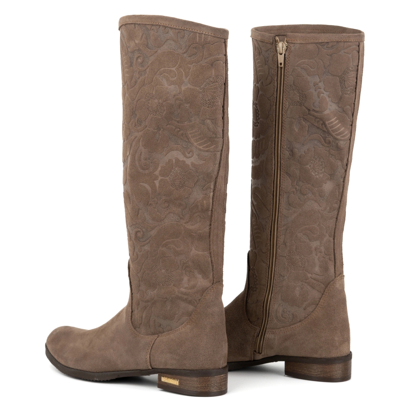 Les bottes en daim des femmes d'Olivier avec du cuir naturel avec des fleurs Emma en relief en beige foncé sont la combinaison parfaite d'élégance et de fonctionnalité. Ces bottes élégantes, en cuir naturel de haute qualité, attirent non seulement leur apparence luxueuse, mais offrent également du confort quotidiennement.
