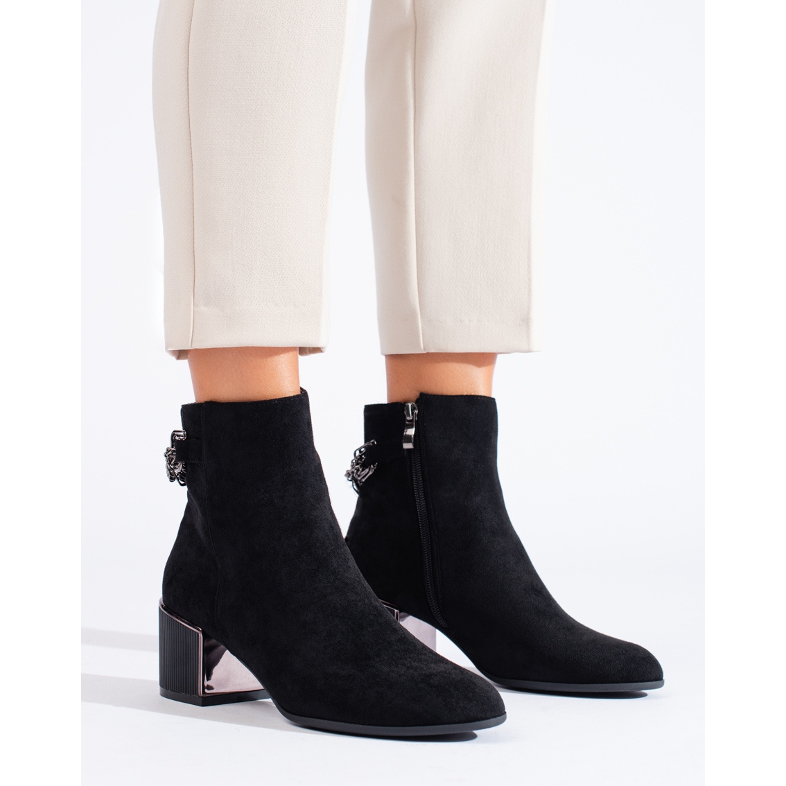 Un avantage supplémentaire réside dans les chaînes décoratives qui confèrent aux chaussures un caractère unique. Les bottines noires sans motif s'adapteront certainement à différents styles, aussi bien au quotidien qu'en soirée.