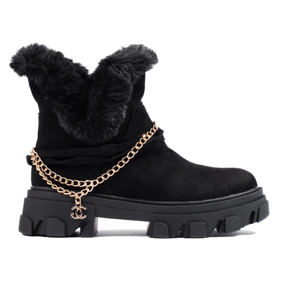 Élégant, confortable et universel - Les bottes des femmes noires en daim écologique sont une proposition idéale pour des jours plus frais. La combinaison d'une coupe classique avec des détails à la mode (chaîne décorative, plate-forme spectaculaire) rend les chaussures parfaites pour chaque jour dans le style de décontracté.