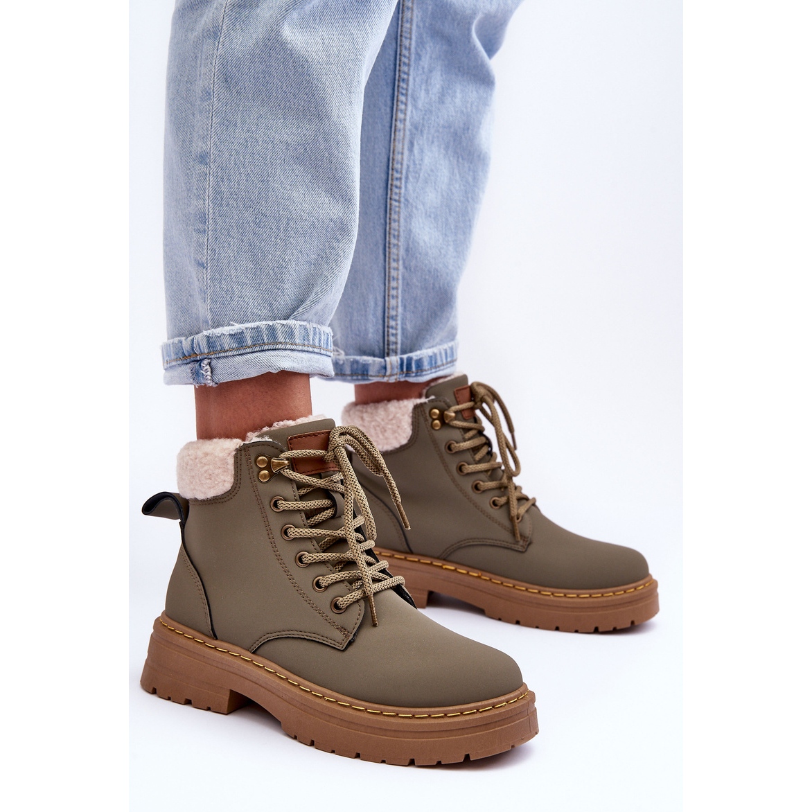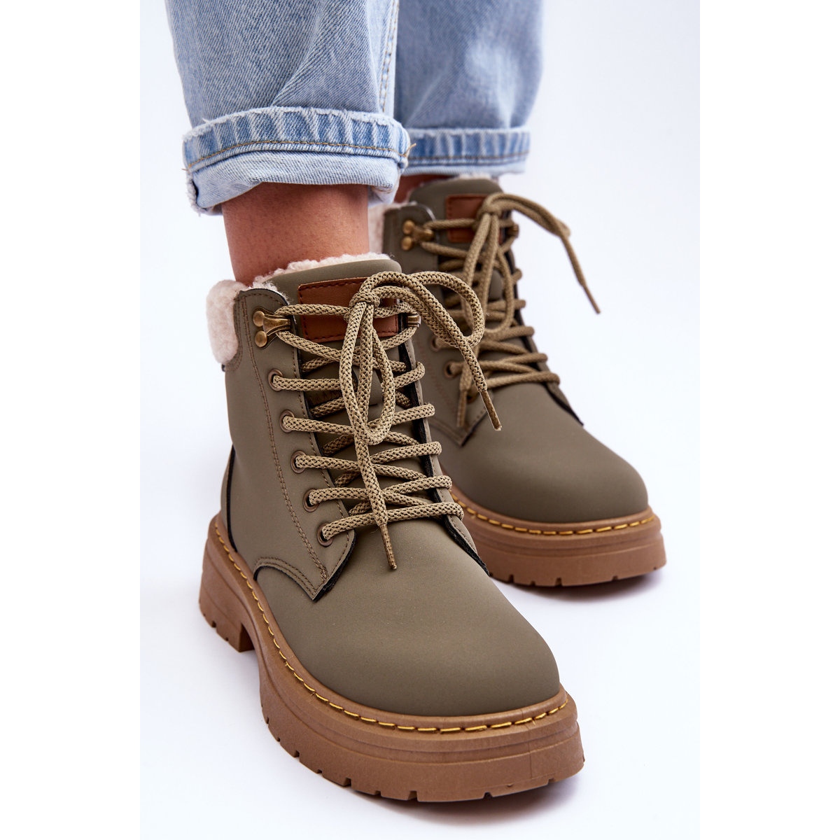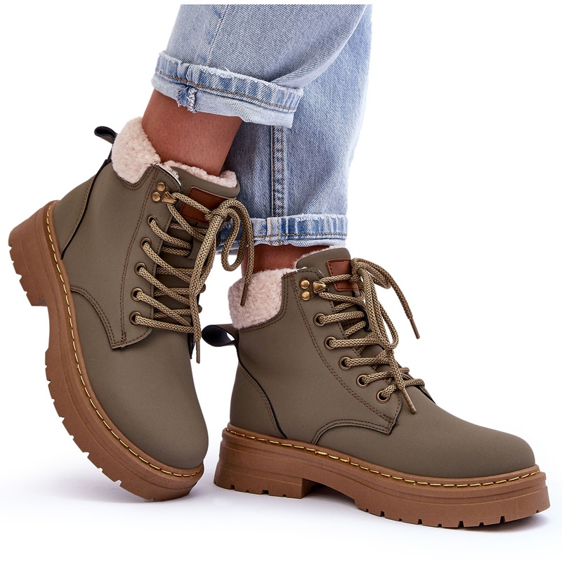 Les bottes pour femmes en peau de mouton vertes Jette sont des chaussures d'hiver en cuir écologique, disponibles en vert. Ce modèle se caractérise par un laçage classique et repose sur une plateforme de 3 cm de hauteur et un talon plat. Ils se caractérisent par une peau de mouton sur le dessus de la tige et à l'intérieur de la languette. Les bottes sont isolées, ce qui les rend parfaites pour les journées plus froides. La hauteur de la tige est de 12,5 cm et sa largeur est de 8 cm.