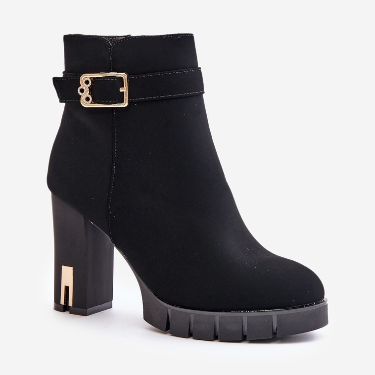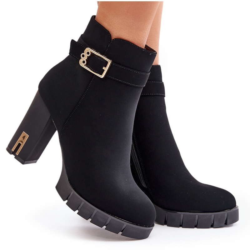 Les bottines isolées à talons hauts pour femmes avec boucle dorée, noires, sont un excellent choix pour les femmes qui apprécient l'élégance et le confort. Fabriqués en cuir écologique de haute qualité, ils sont élégants et fonctionnels. Un talon bloc de 10 cm de haut ajoute non seulement de la classe et allonge la silhouette, mais assure également la stabilité lors de la marche.