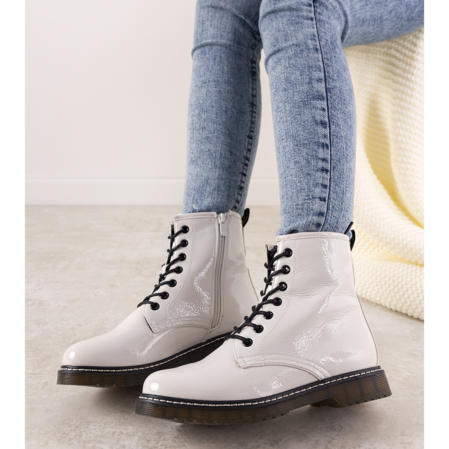 Découvrez un style unique et un confort de port grâce aux bottes bovver blanches vernies pour femme Peve ! Ces bottines élégantes, confectionnées en cuir verni de haute qualité, s'intègrent parfaitement dans les tendances chaussures de la saison automne-hiver. Grâce à la fermeture éclair cousue à l'intérieur, enfiler et enlever les chaussures devient un jeu d'enfant.
