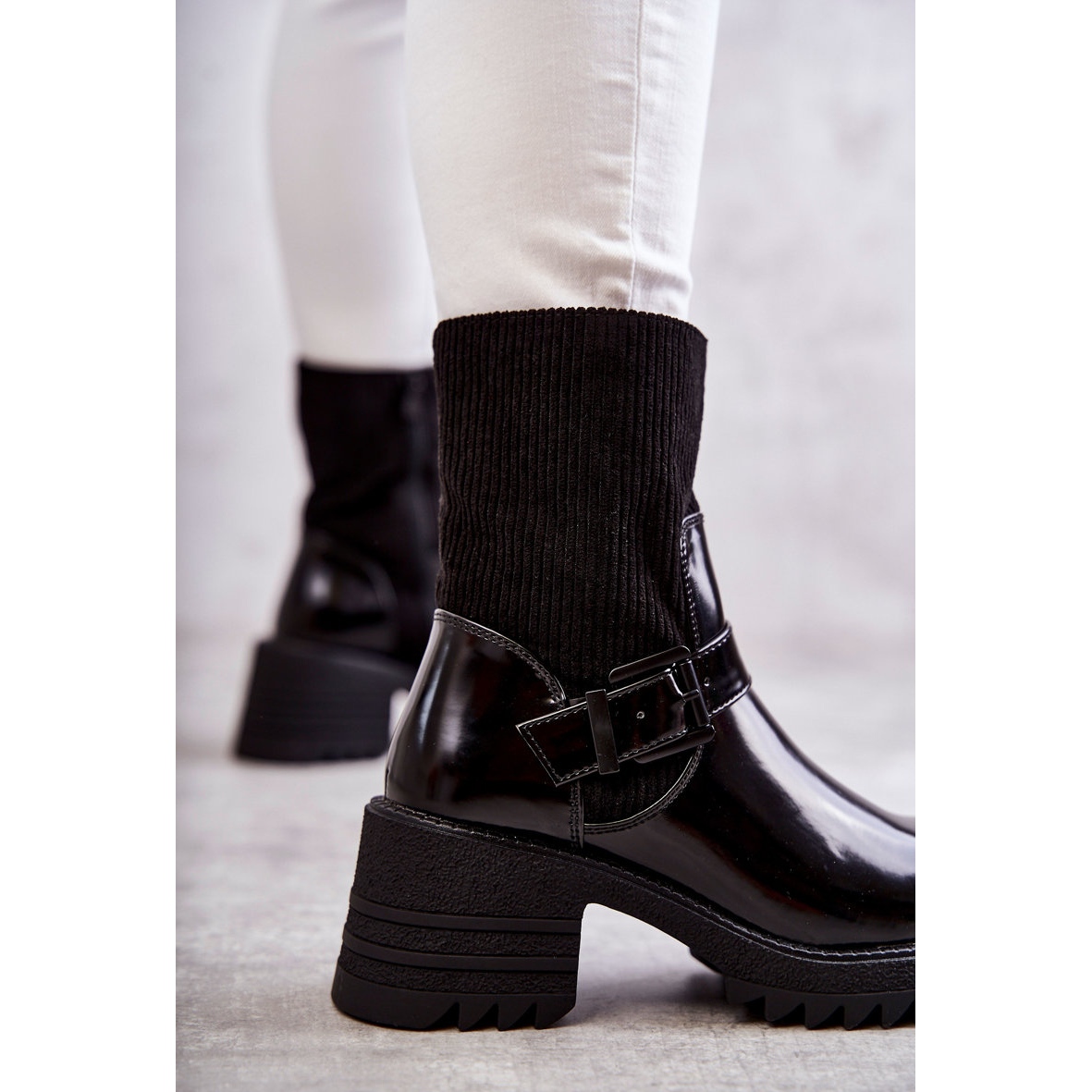 Des bottes élégantes et pratiques créées pour des jours plus froids. La combinaison de cuir écologique verni avec un matériau ressemblant à des bouchons de nuit leur donne un caractère à la mode et quelque peu rocheux et une isolation sous la forme d'une couverture de chaussures assure un confort thermique. Une semelle massive avec une bande de roulement irrégulière et un talon stable de 7 cm avec un confort de garantie de plate-forme de 2,5 cm et une certaine étape, tandis qu'une boucle décorative avec une ceinture réglable ajoute un accent élégant.